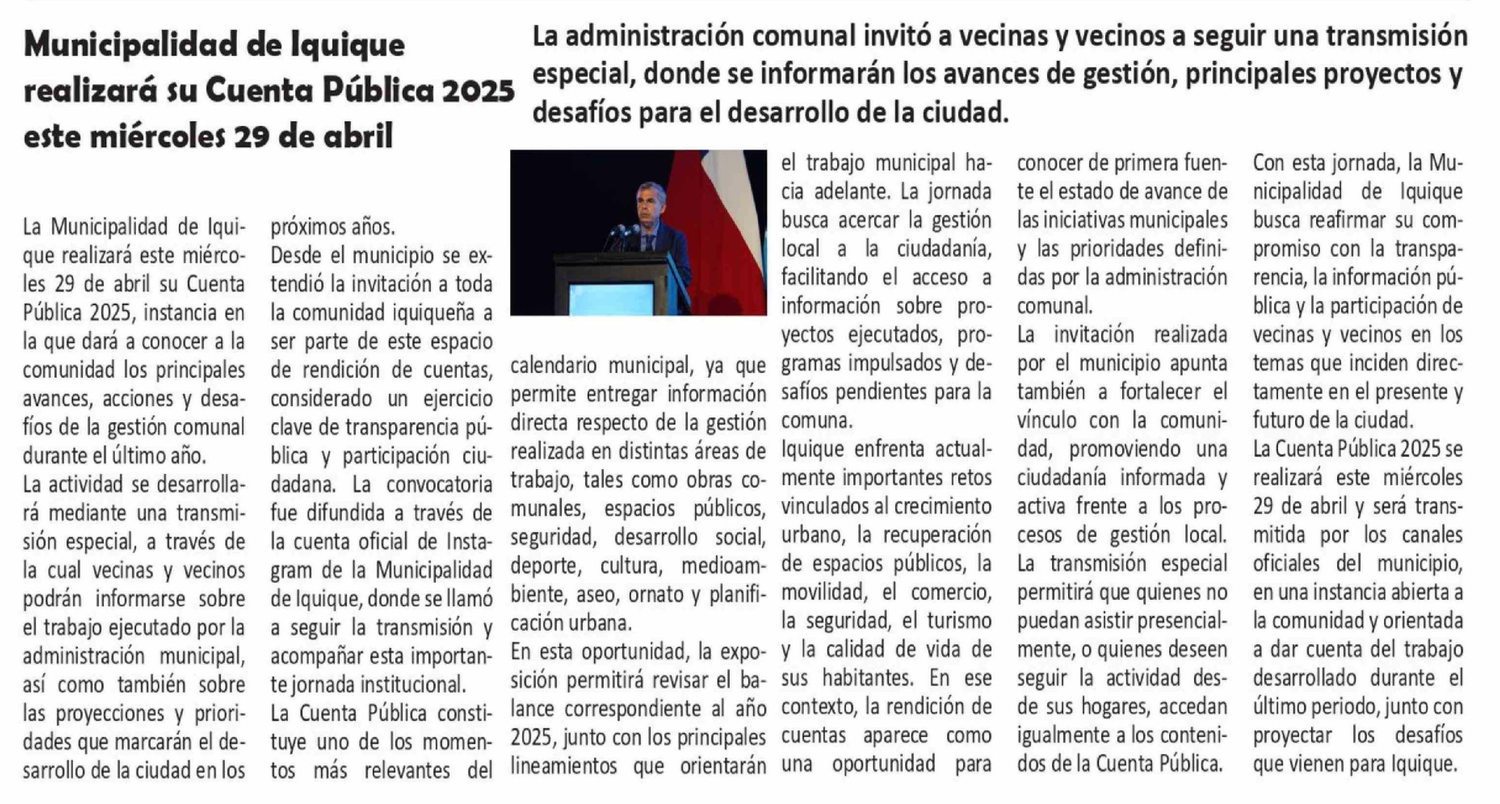 Municipalidad de Iquique realizará su Cuenta Pública 2025 este miércoles 29 de abril