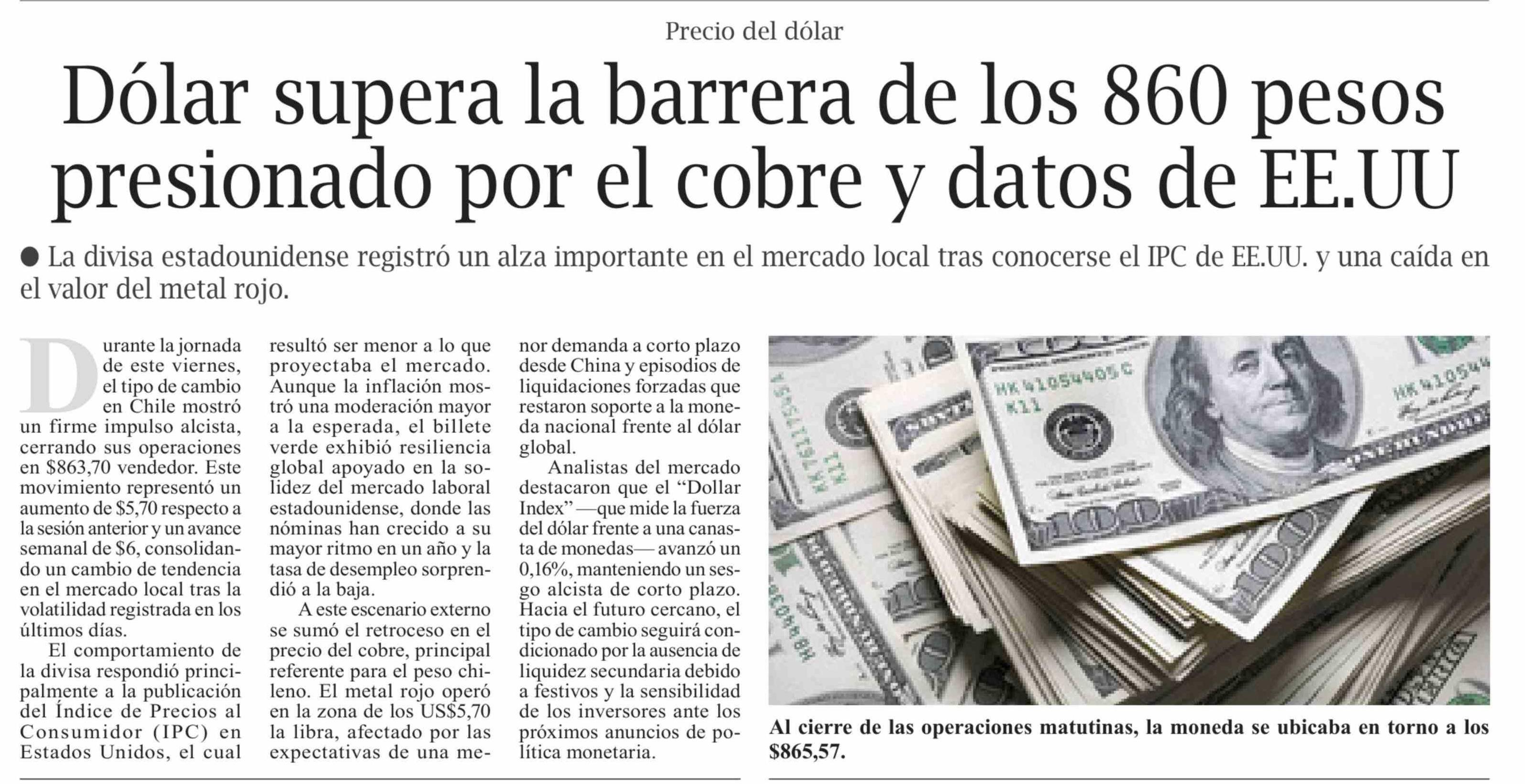Dólar supera la barrera de los 860 pesos presionado por el cobre y datos de EE.UU