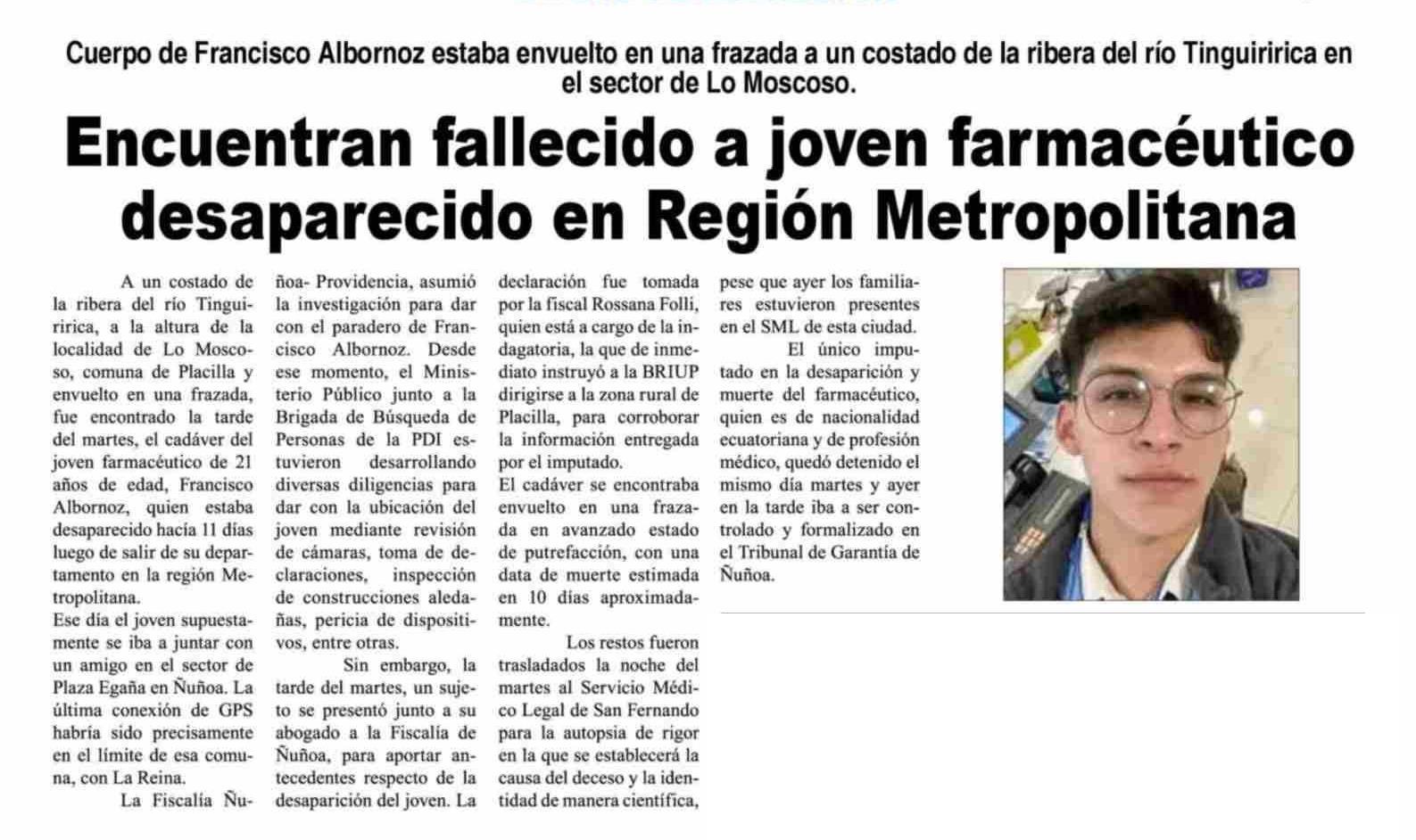 Encuentran fallecido a joven farmacéutico desaparecido en Región Metropolitana
