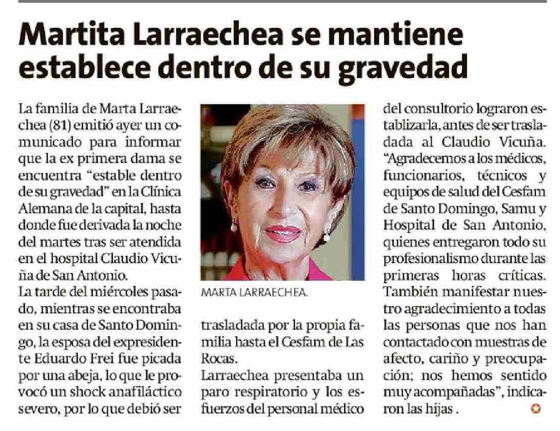 Martita Larraechea se mantiene establece dentro de su gravedad