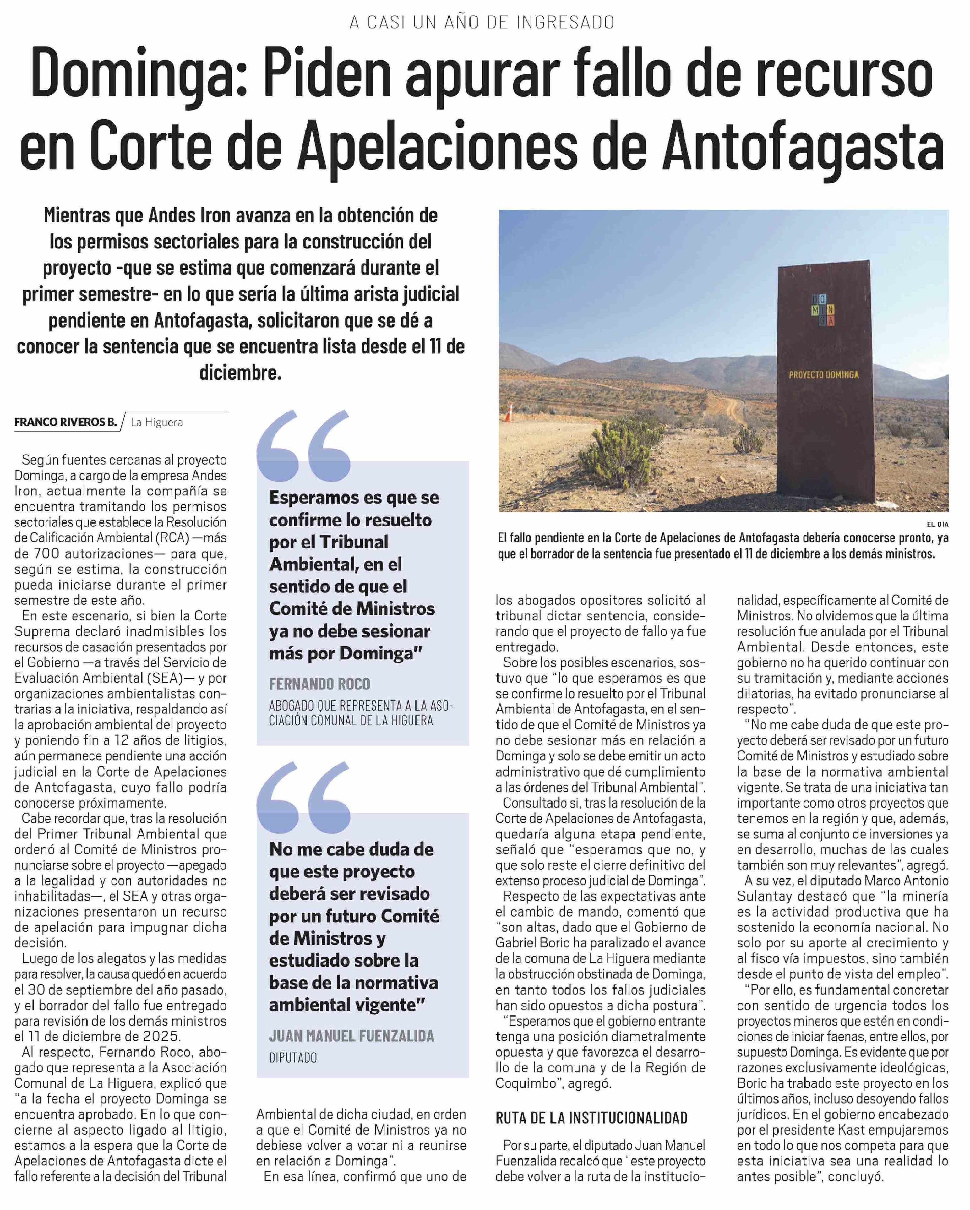 Título: Dominga: Piden apurar fallo de recurso en Corte de Apelaciones de Antofagasta