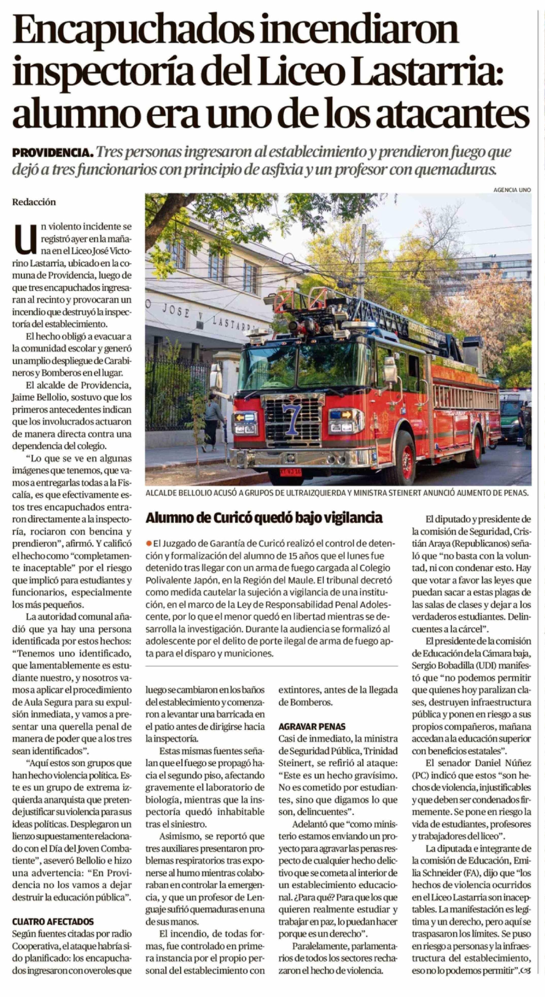 Encapuchados incendiaron inspectoría del Liceo Lastarria: alumno era uno de los atacantes