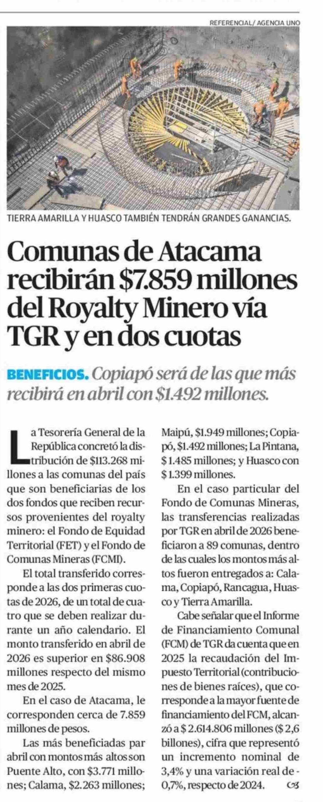 Comunas de Atacama recibirán $7.859 millones del Royalty Minero vía TGR y en dos cuotas