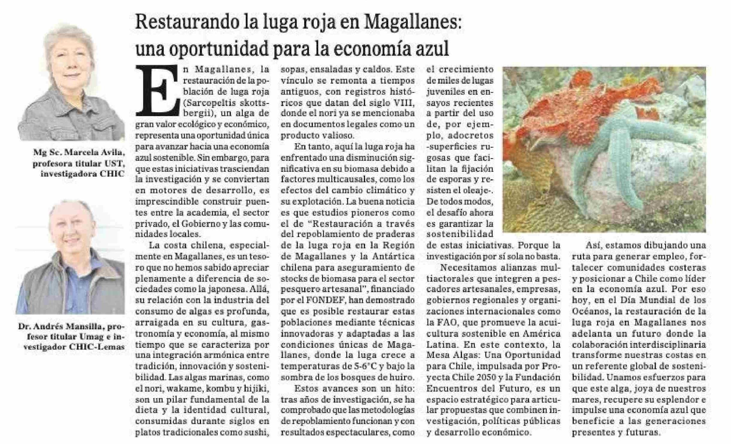 COLUMNAS DE OPINIÓN: Restaurando la luga roja en Magallanes: una oportunidad para la economía azul
