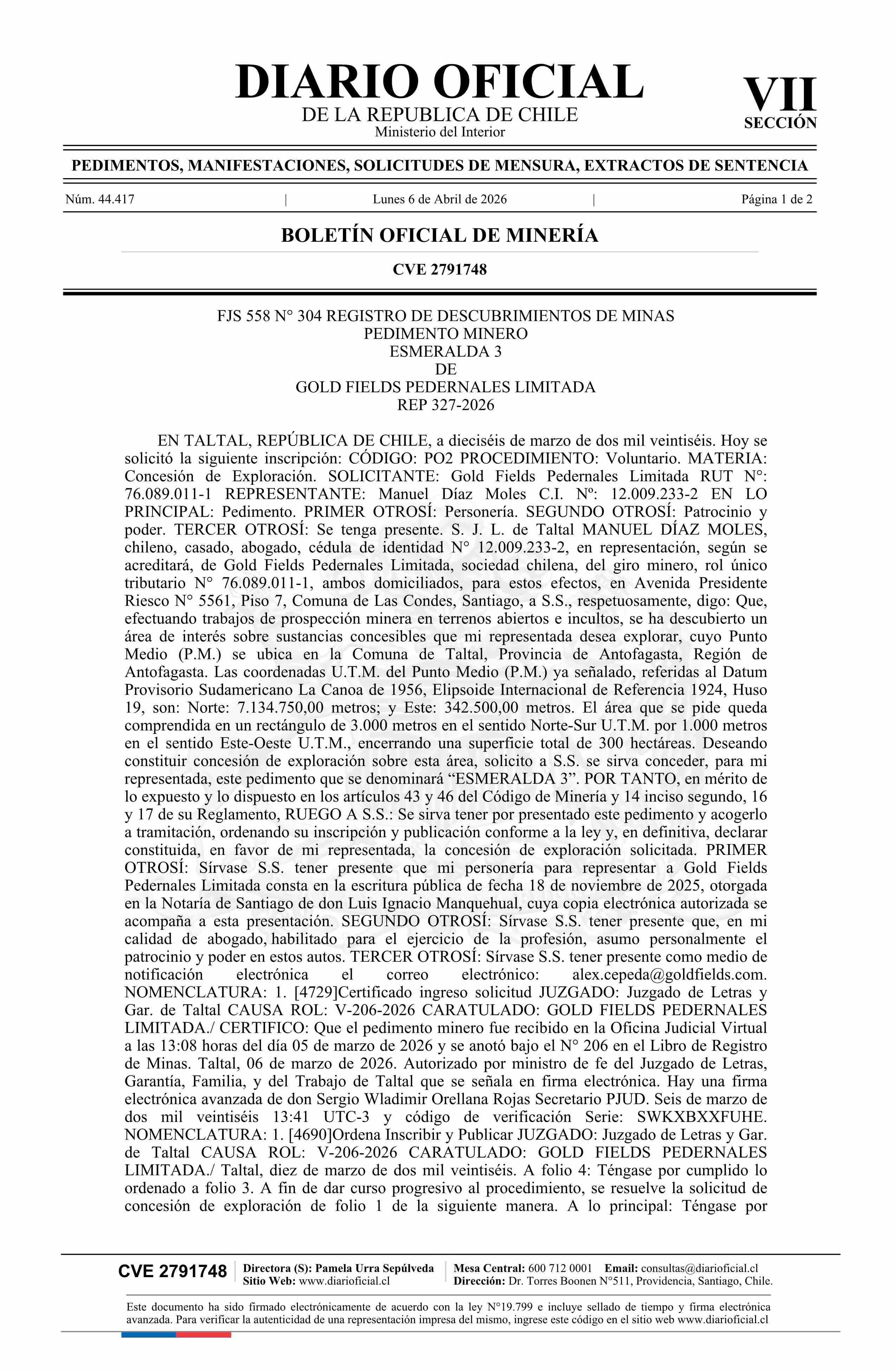 ESMERALDA 3 / Gold Fields Pedernales Limitada