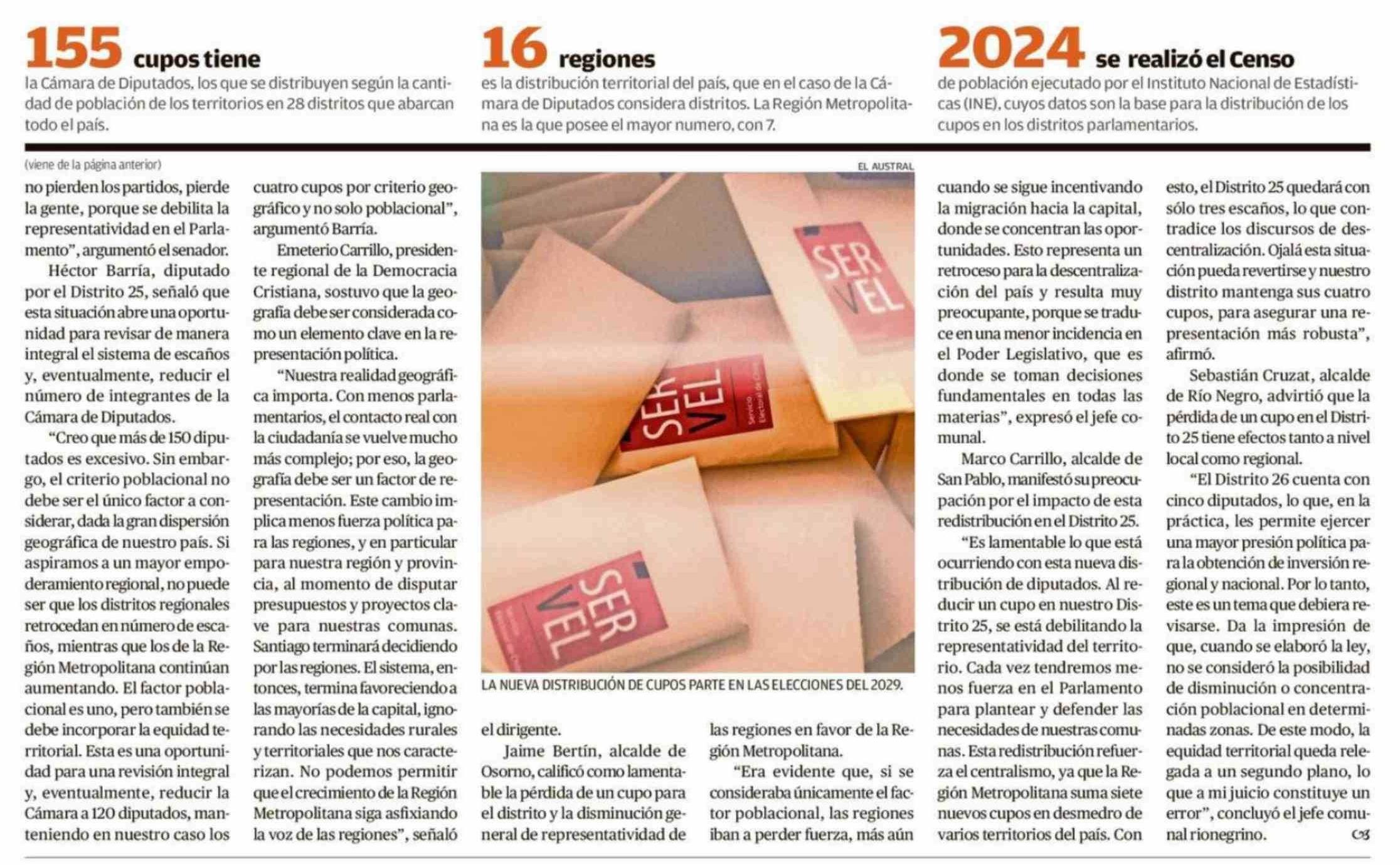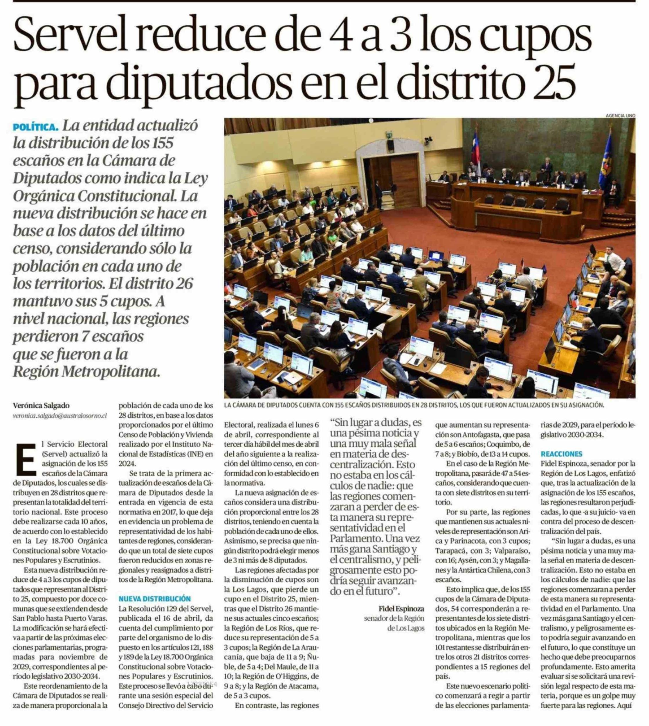 Servel reduce de 4 a 3 los cupos para diputados en el distrito 25