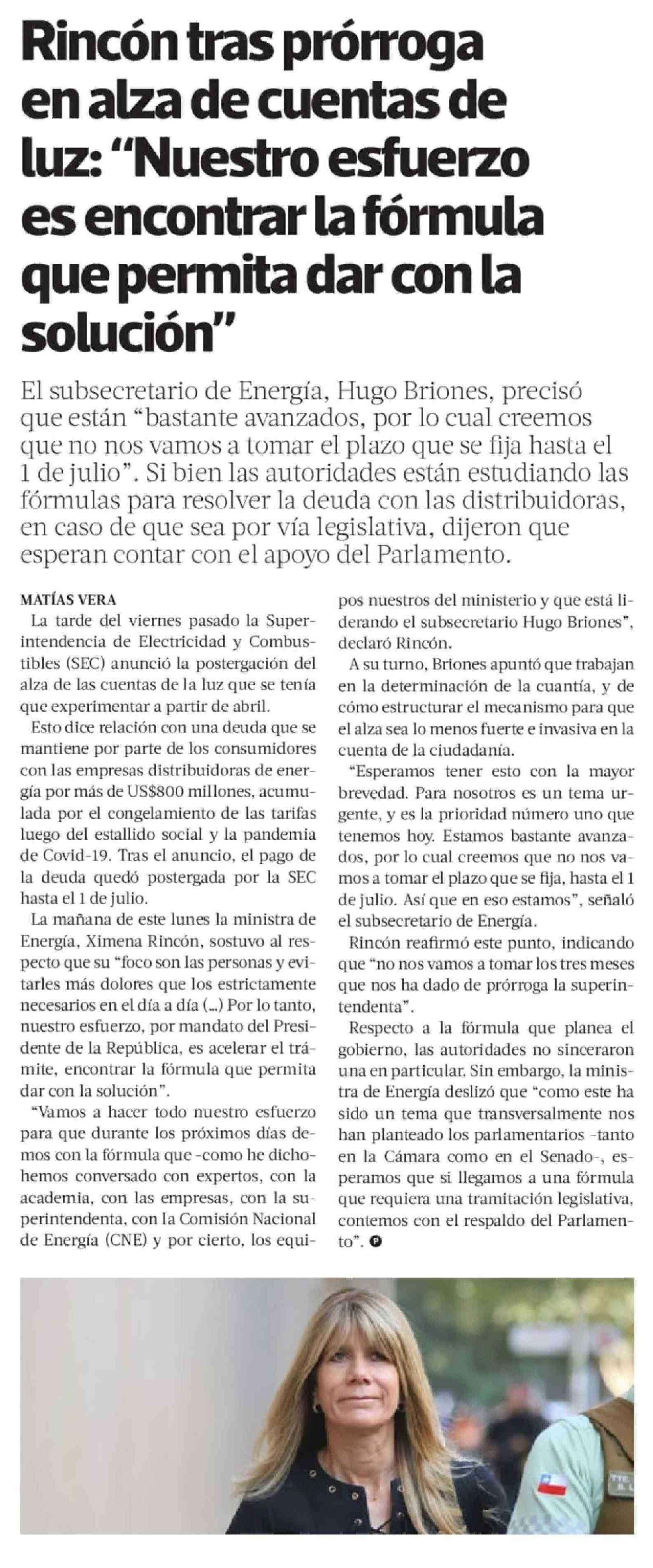 Rincón tras prórroga en alza de cuentas de luz: "Nuestro esfuerzo es encontrar la fórmula que permita dar con la solución"