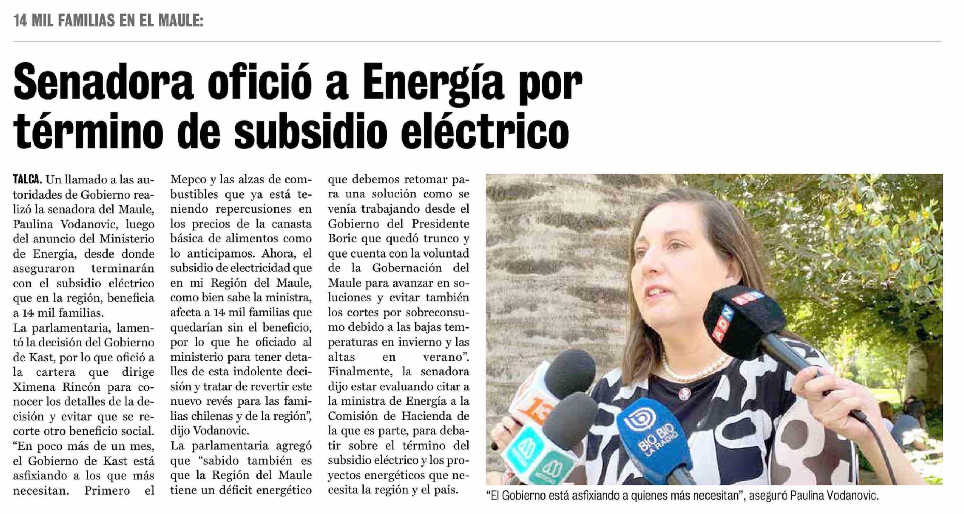Senadora ofició a Energía por término de subsidio eléctrico