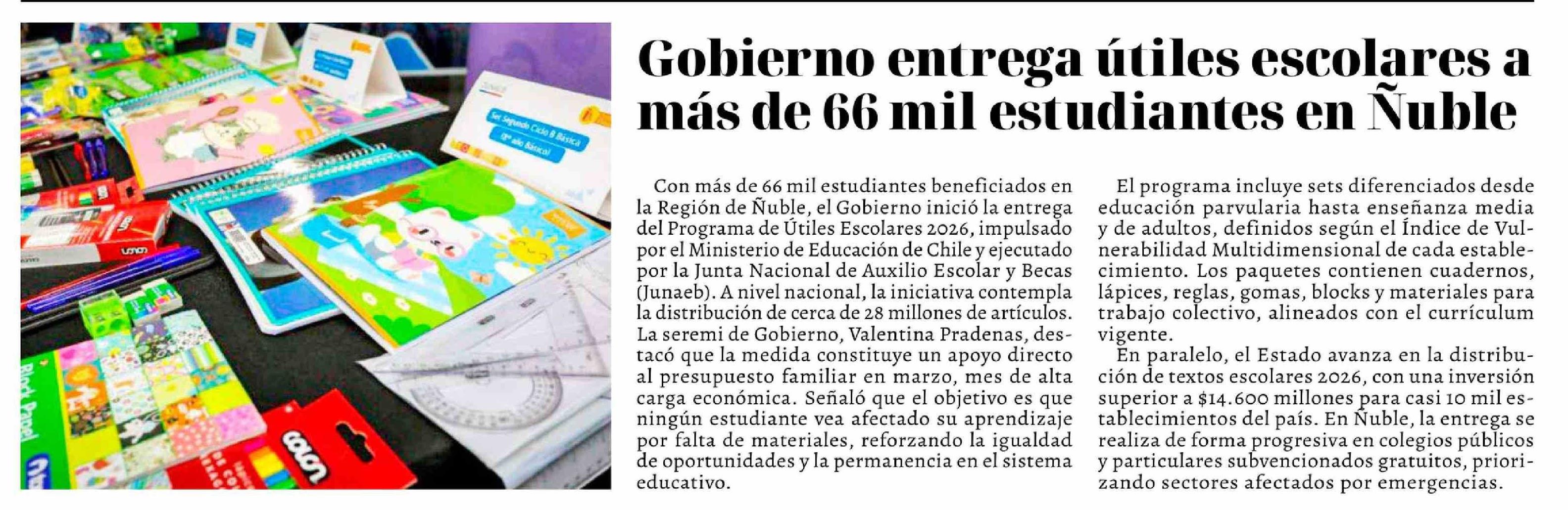 Gobierno entrega útiles escolares a más de 66 mil estudiantes en Ñuble
