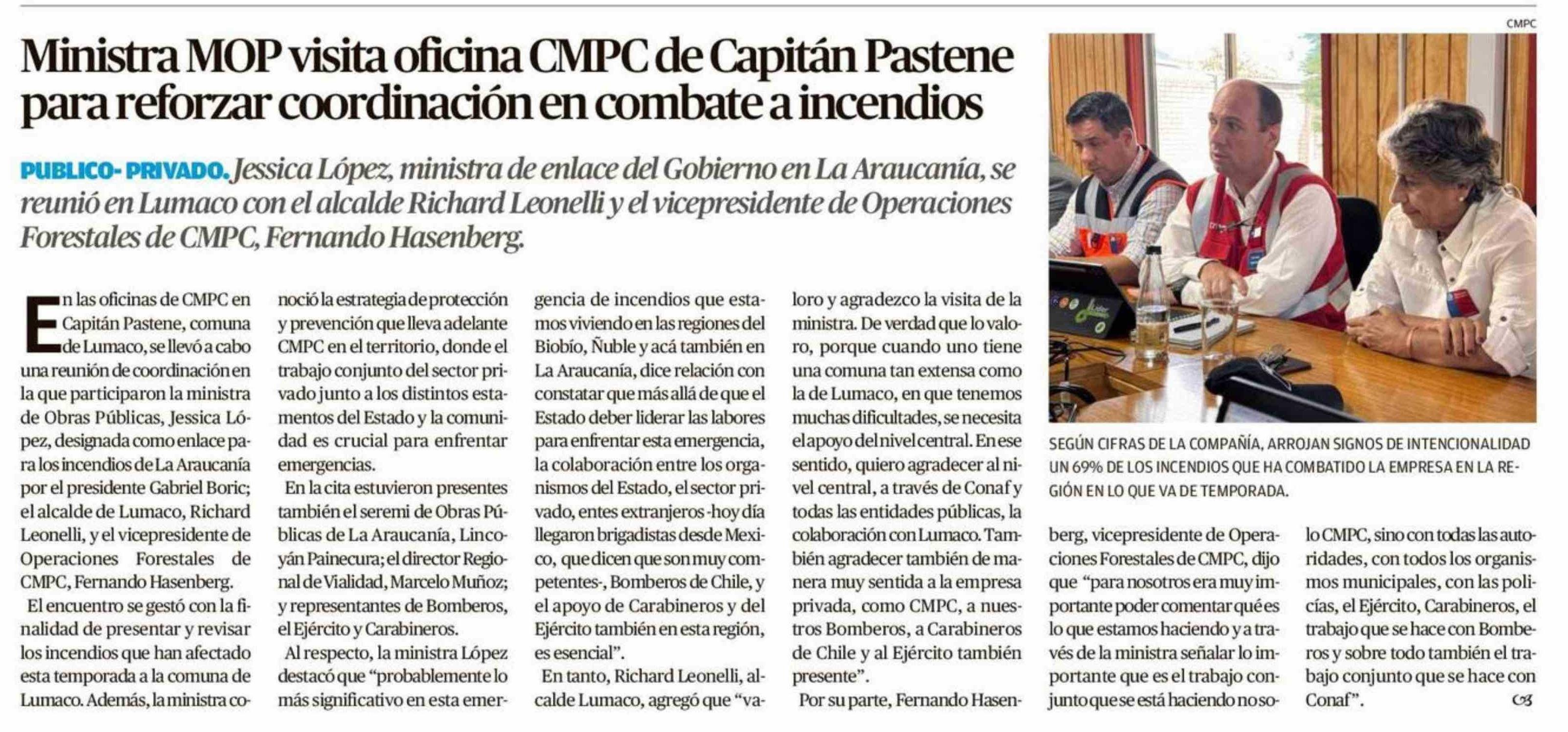 Ministra MOP visita oficina CMPC de Capitán Pastene para reforzar coordinación en combate a incendios