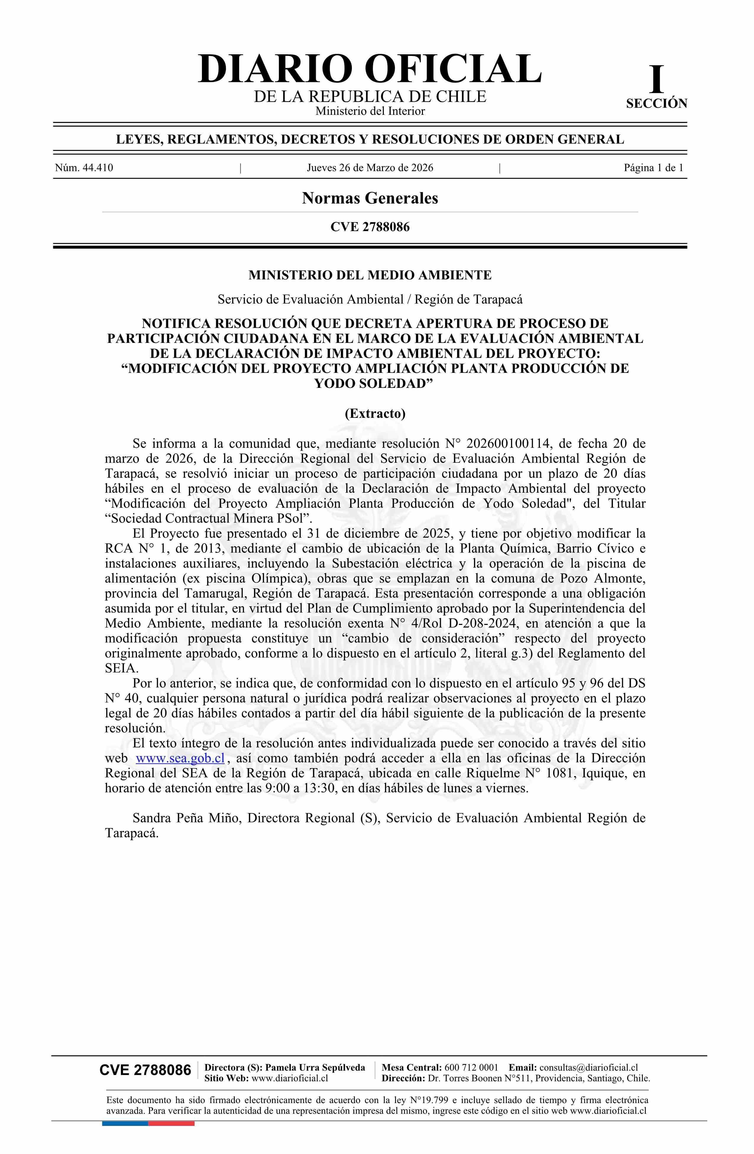 Título: Extracto de resolución exenta número 202600100114, de 2026.- Inicia proceso de participación ciudadana en el marco de la evaluación ambiental de la Declaración de Impacto Ambiental del proyecto Modificación del Proyecto Ampliación Planta Producción de Yodo Soledad