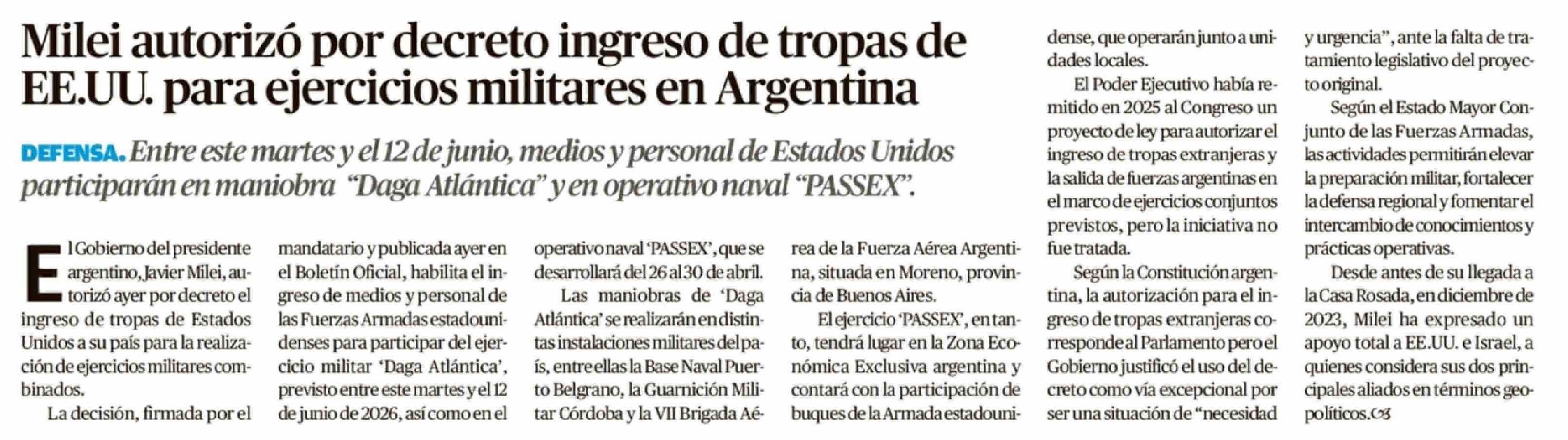 Milei autorizó por decreto ingreso de tropas de EE.UU. para ejercicios militares en Argentina