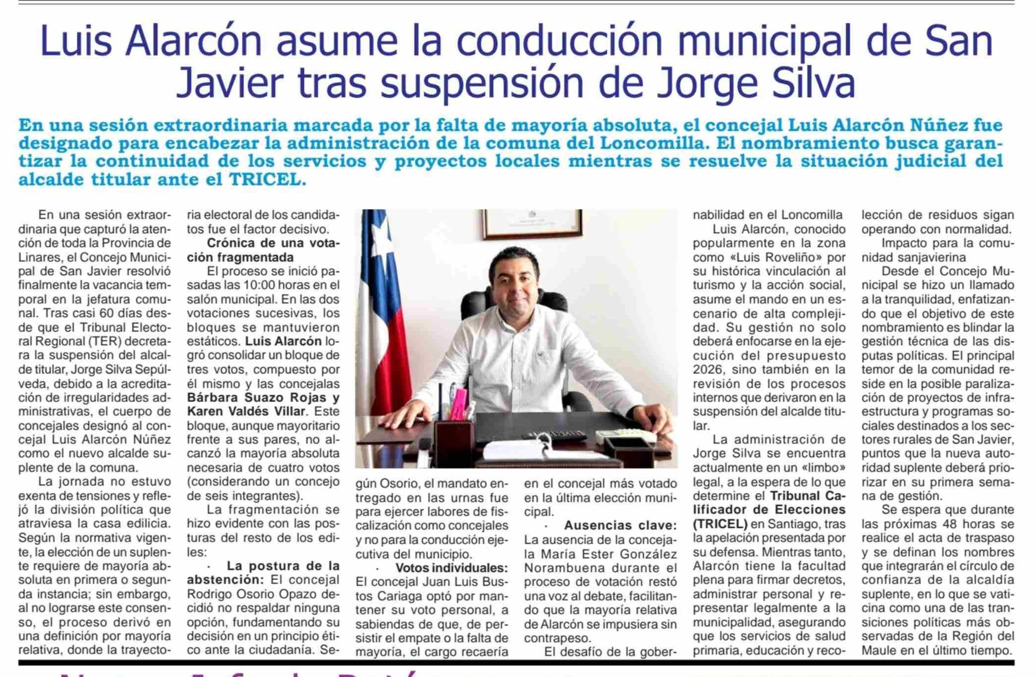 Luis Alarcón asume la conducción municipal de San Javier tras suspensión de Jorge Silva