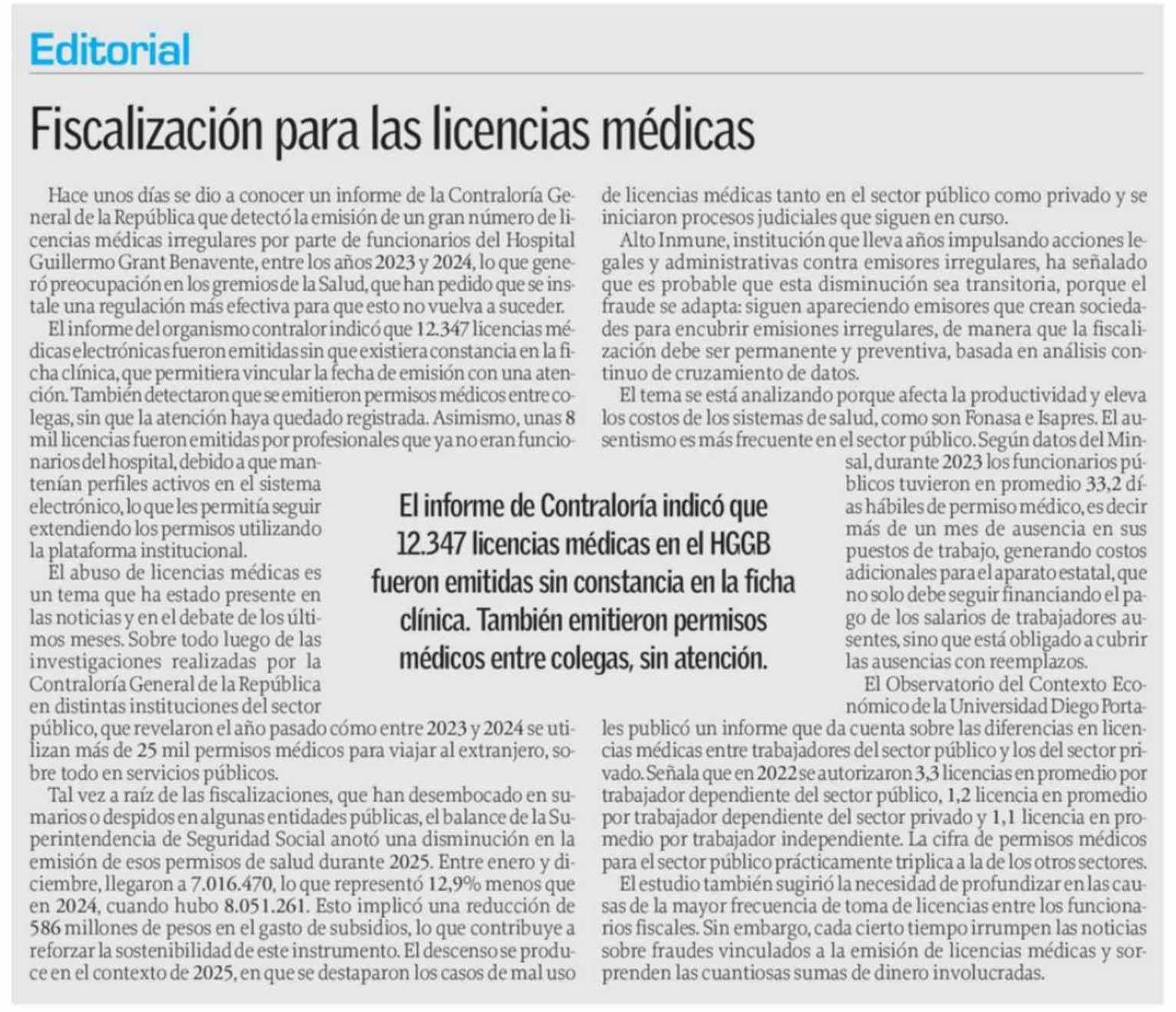 Título: Editorial: Fiscalización para las licencias médicas