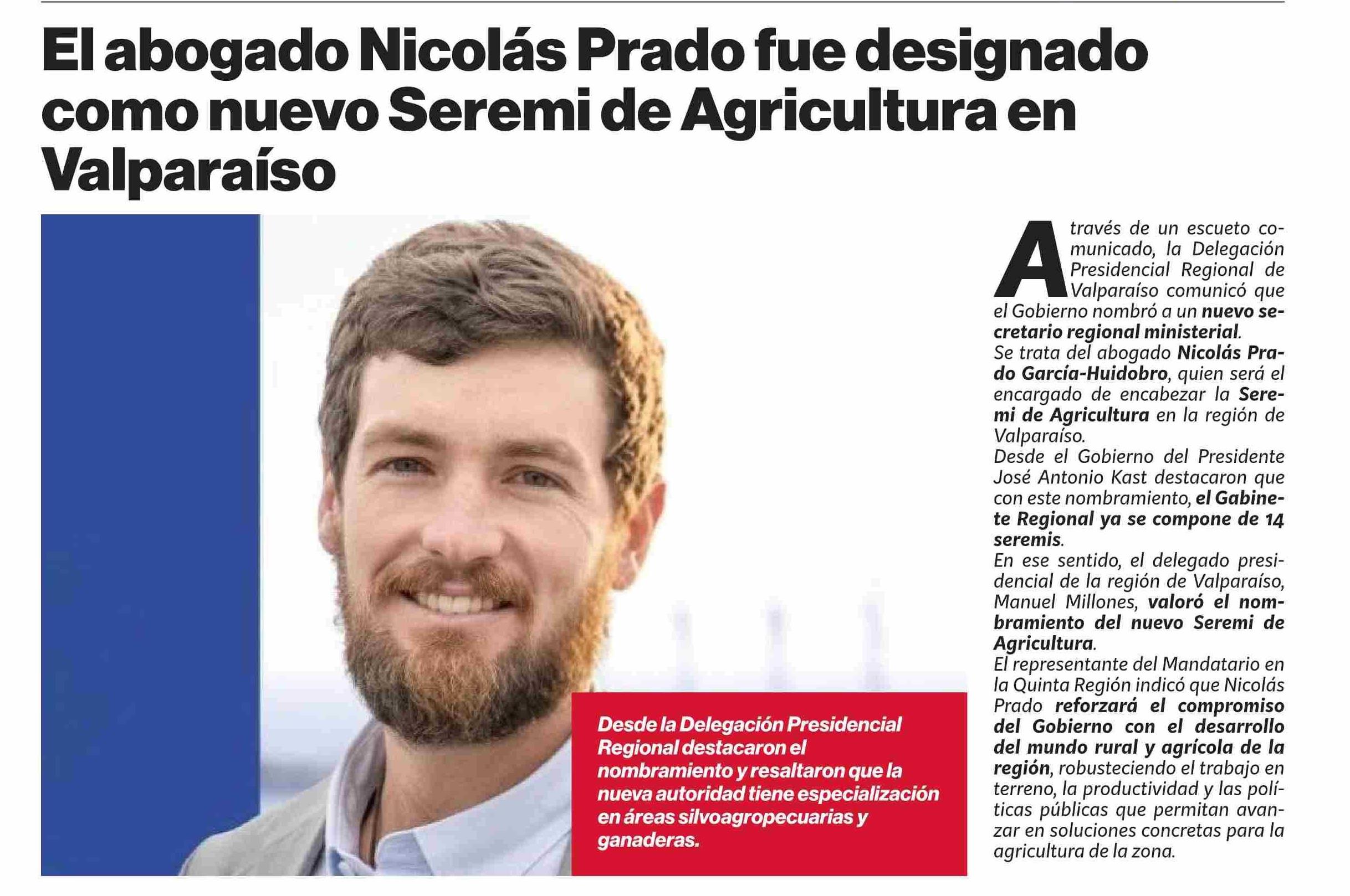 El abogado Nicolás Prado fue designado como nuevo Seremi de Agricultura en Valparaíso