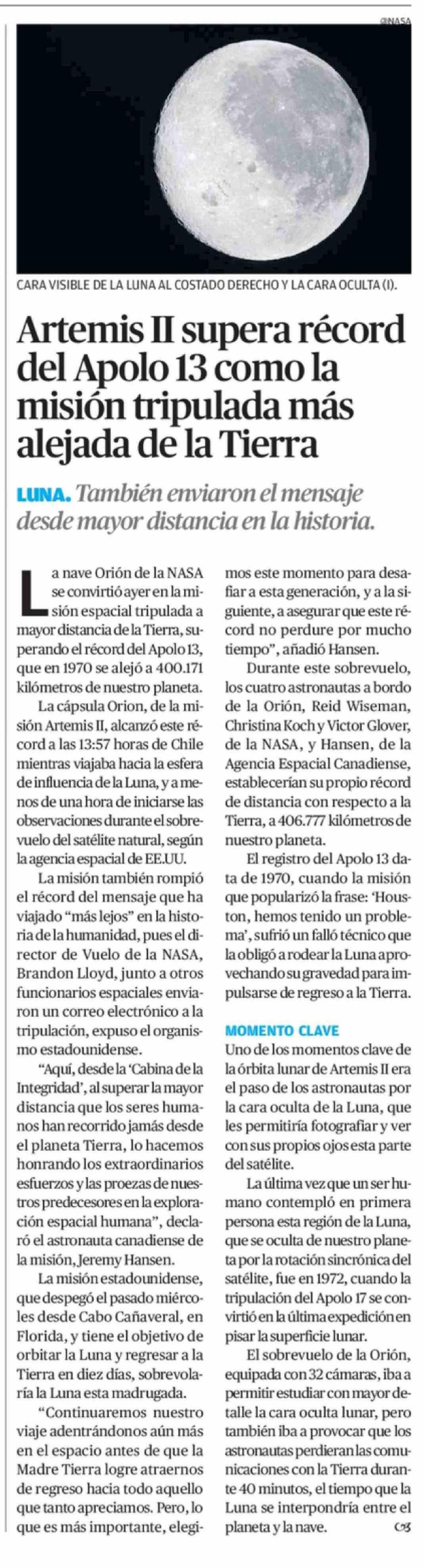 Artemis II supera récord del Apolo 13 como la misión tripulada más alejada de la Tierra