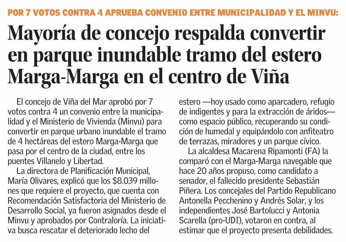 Mayoría de concejo respalda convertir en parque inundable tramo del estero Marga-Marga en el centro de Viña