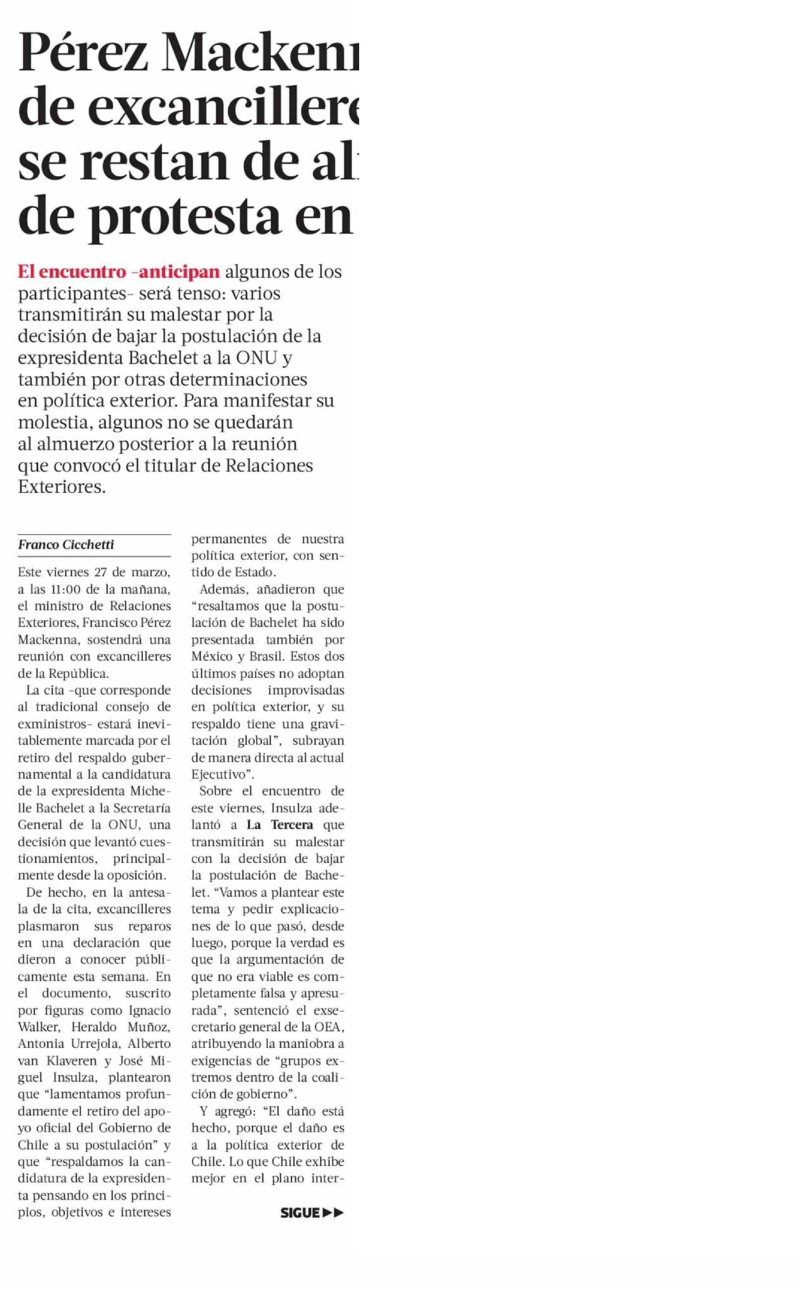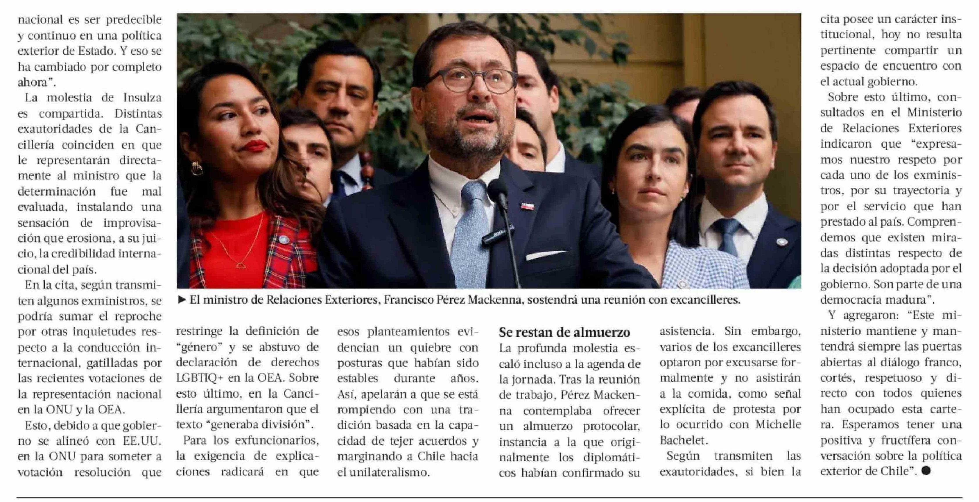 Pérez Mackenna cita a consejo de excancilleres, pero algunos se restan de almuerzo en señal de protesta en favor de Bachelet