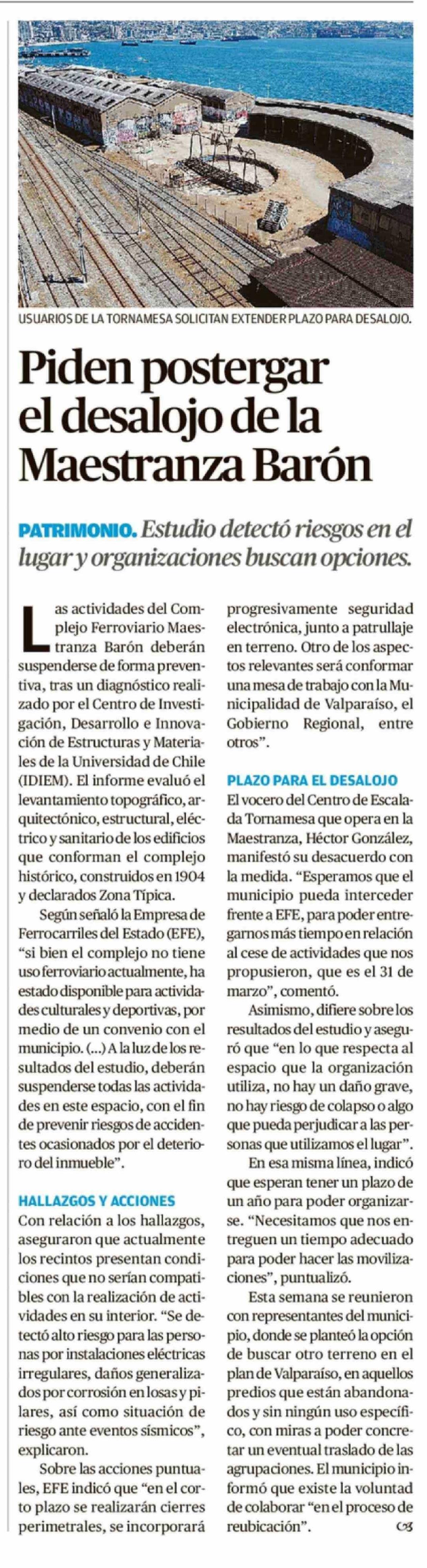 Piden postergar el desalojo de la Maestranza Barón