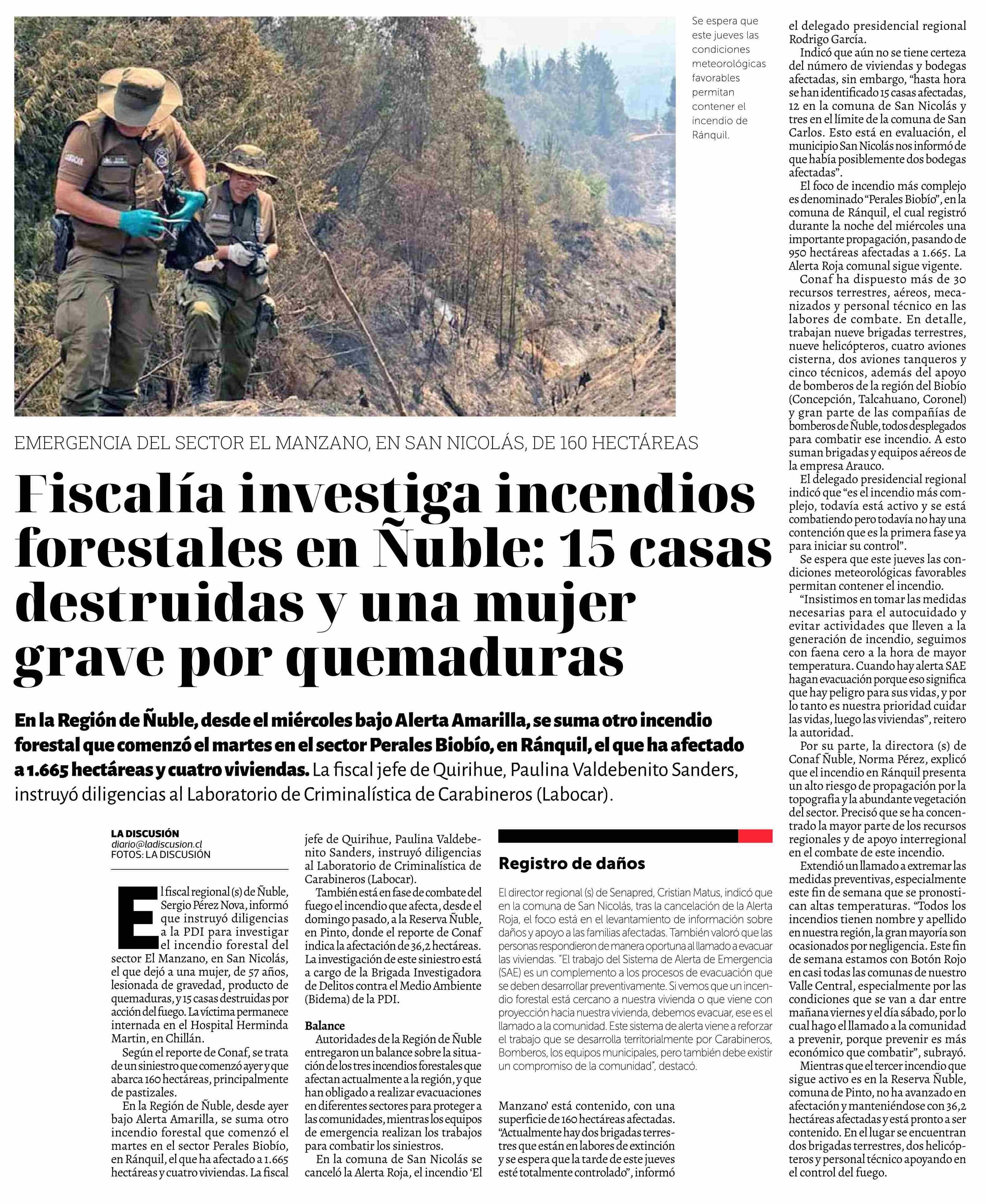 Fiscalía investiga incendios forestales en Nuble: 15 casas destruidas y una mujer grave por quemaduras