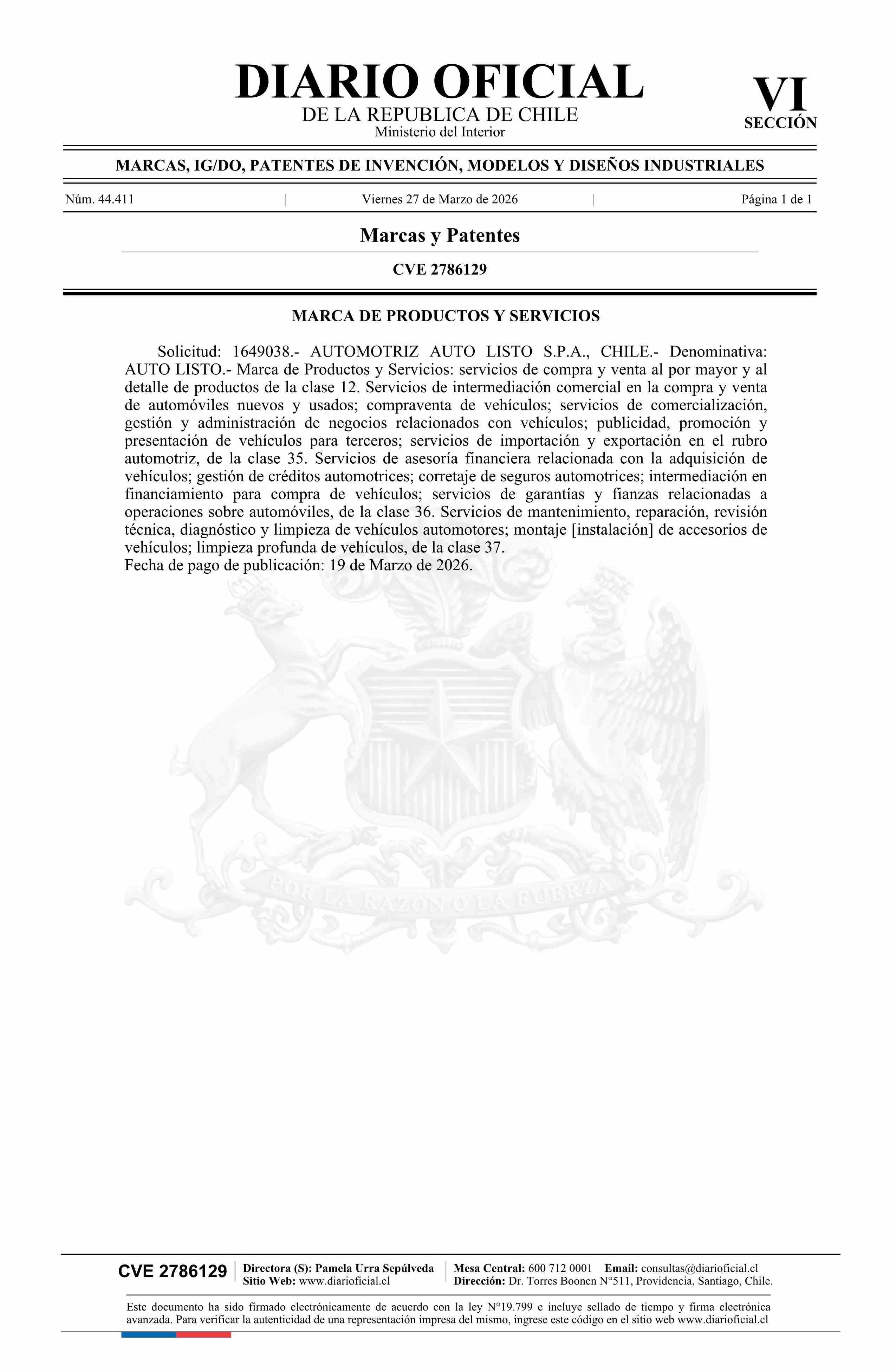 Diario Oficial Edición Electrónica (Diario Oficial de Chile - 6 Marcas Y Patentes)