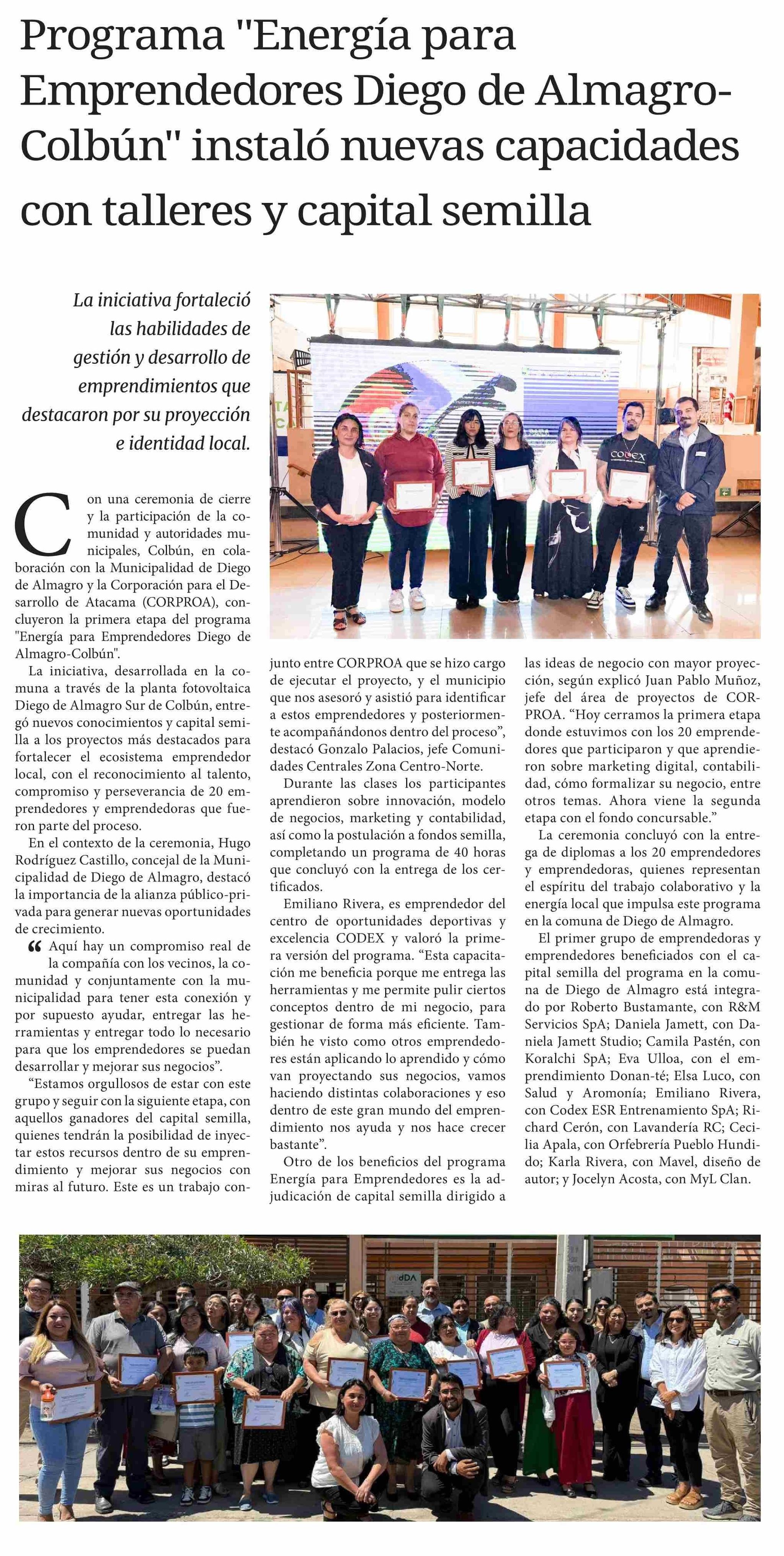 Programa "Energía para Emprendedores Diego de AlmagroColbún" instaló nuevas capacidades con talleres y capital semilla