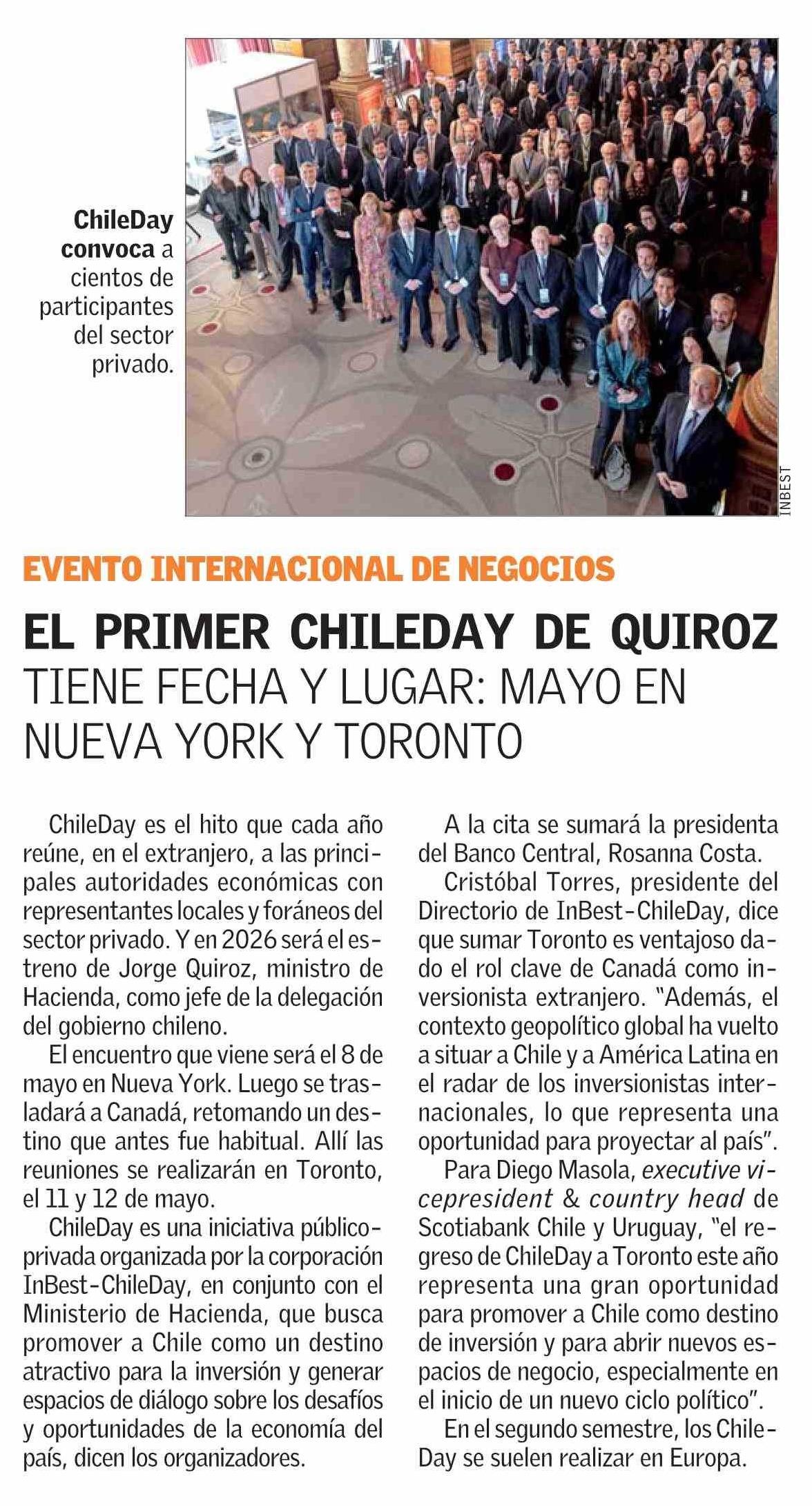 EL PRIMER CHILEDAY DE QUIROZ TIENE FECHA Y LUGAR: MAYO EN NUEVA YORK Y TORONTO