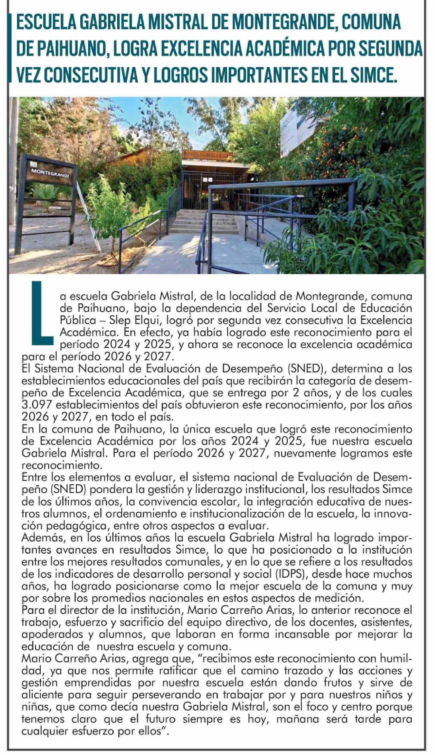 ESCUELA GABRIELA MISTRAL DE MONTEGRANDE, COMUNA DE PAIHUANO, LOGRA EXCELENCIA ACADÉMICA POR SEGUNDA VEZ CONSECUTIVA Y LOGROS IMPORTANTES EN EL SIMCE.