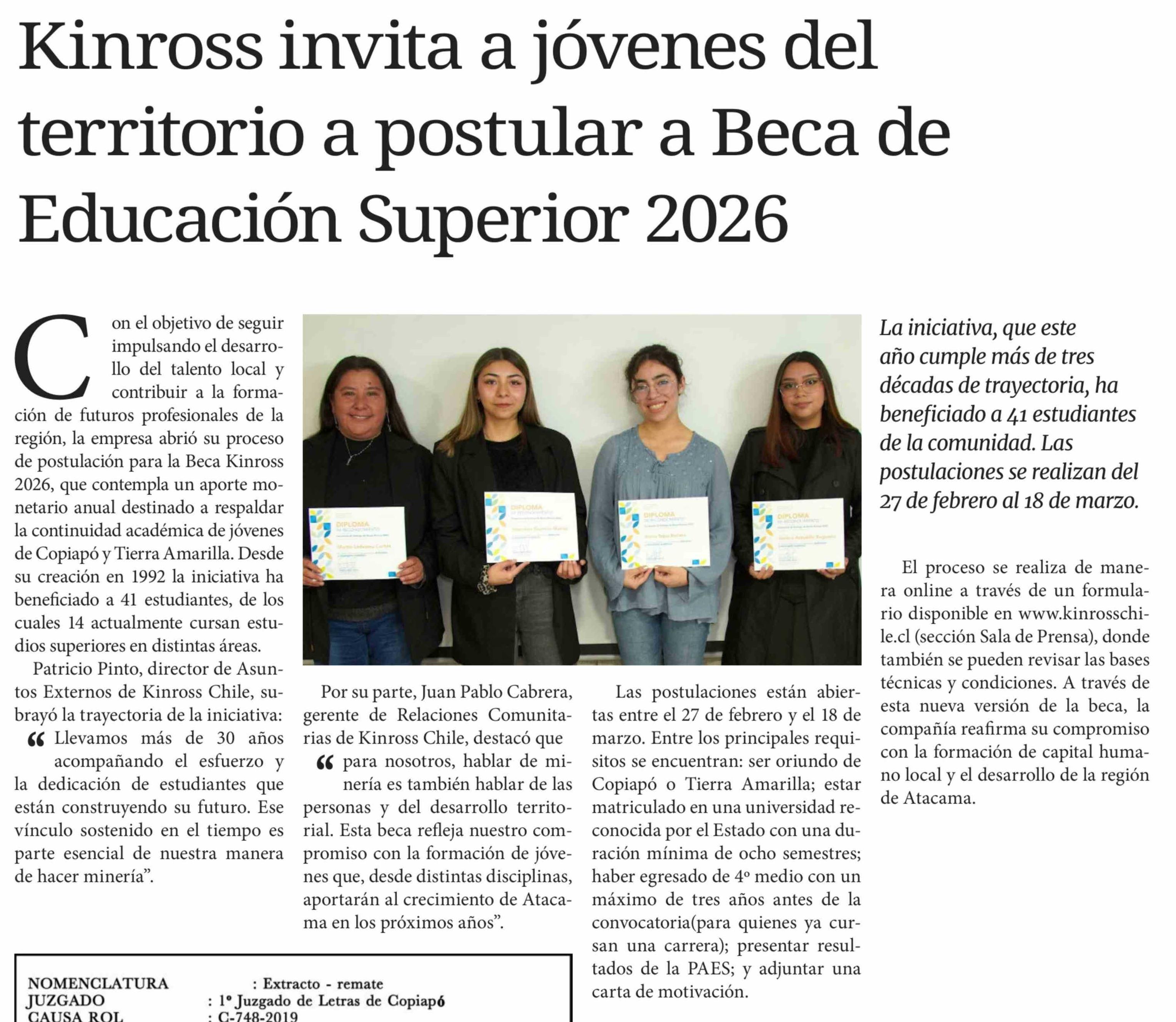 Título: Kinross invita a jóvenes del territorio a postular a Beca de Educación Superior 2026