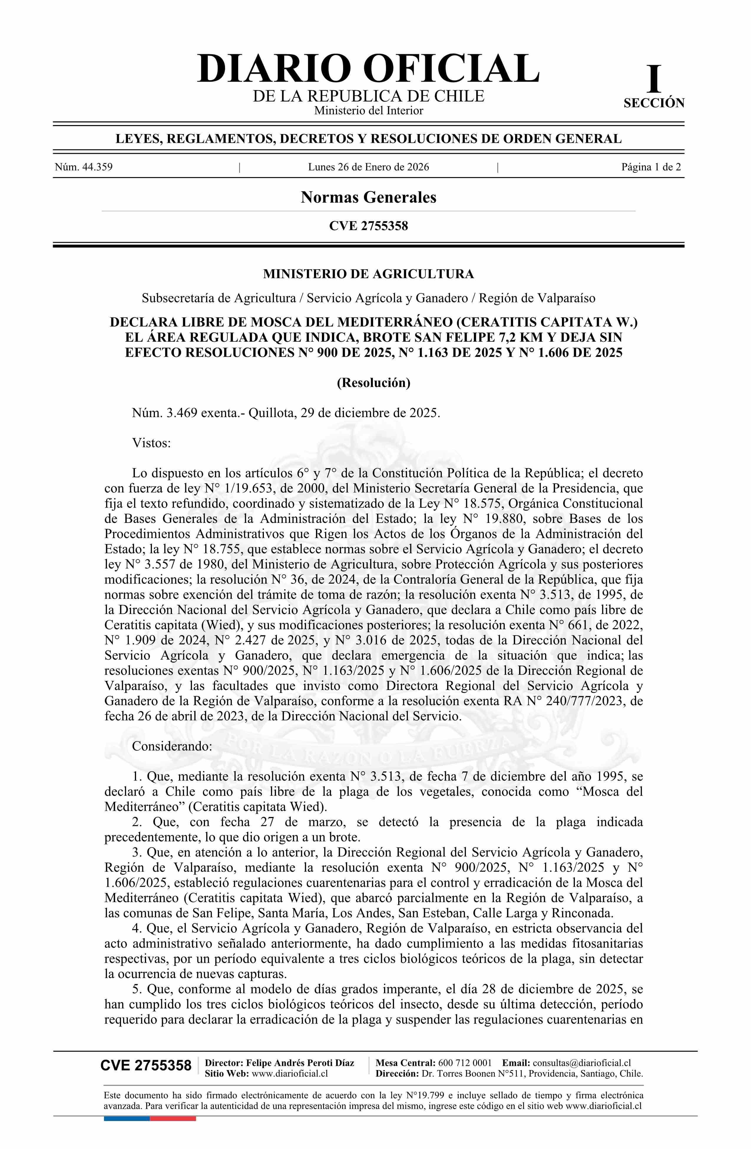 | Título: | Resolución exenta número 3.469, de 2025.- Declara libre de Mosca del Mediterráneo (Ceratitis capitata W.) el área regulada que indica: Brote San Felipe 7,2 Km y deja sin efecto resoluciones exentas Nos. 900, 1.163 y 1.606, todas de 2025 |