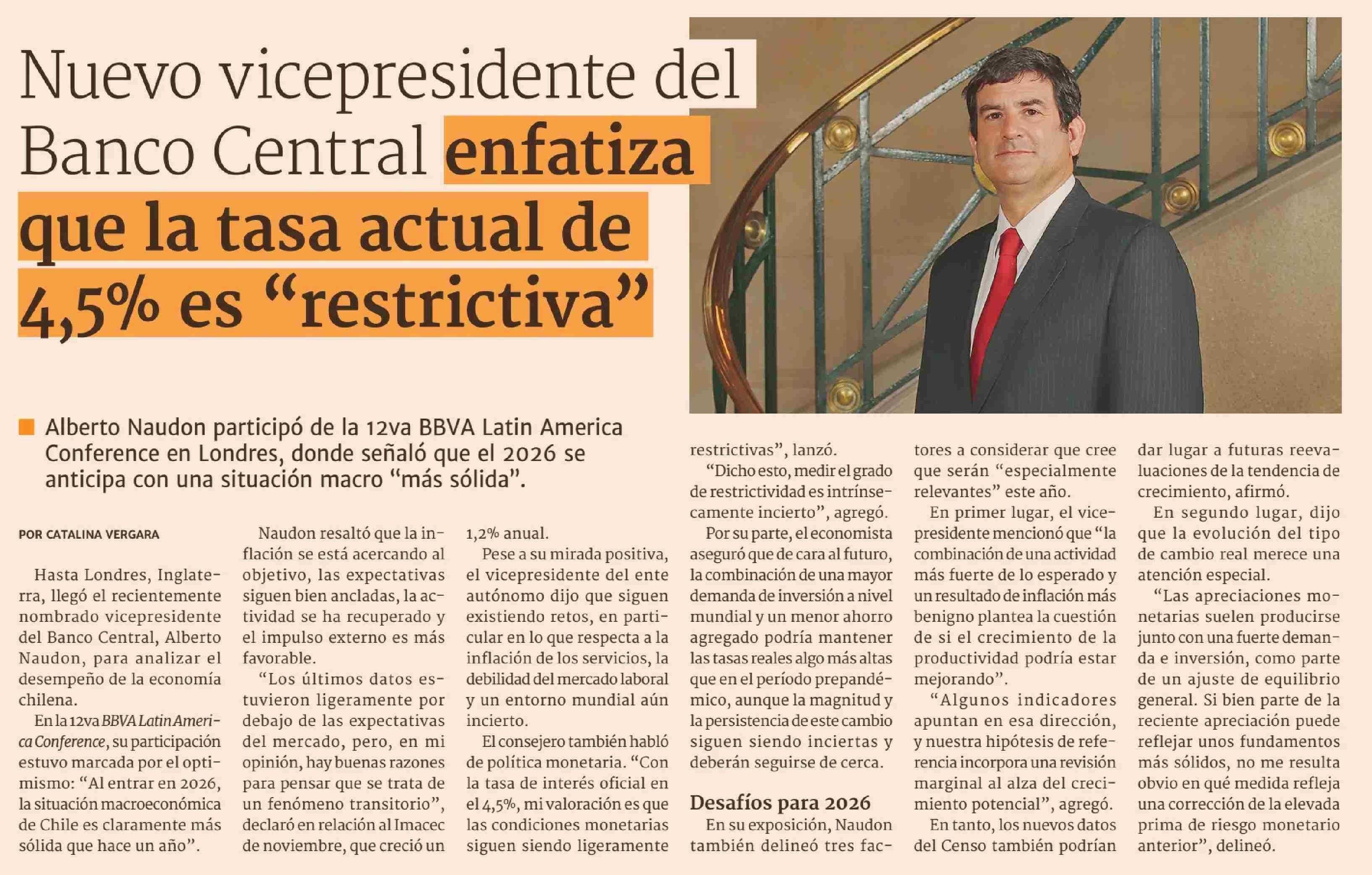 Nuevo vicepresidente del Banco Central enfatiza que la tasa actual de 4,5% es "restrictiva"