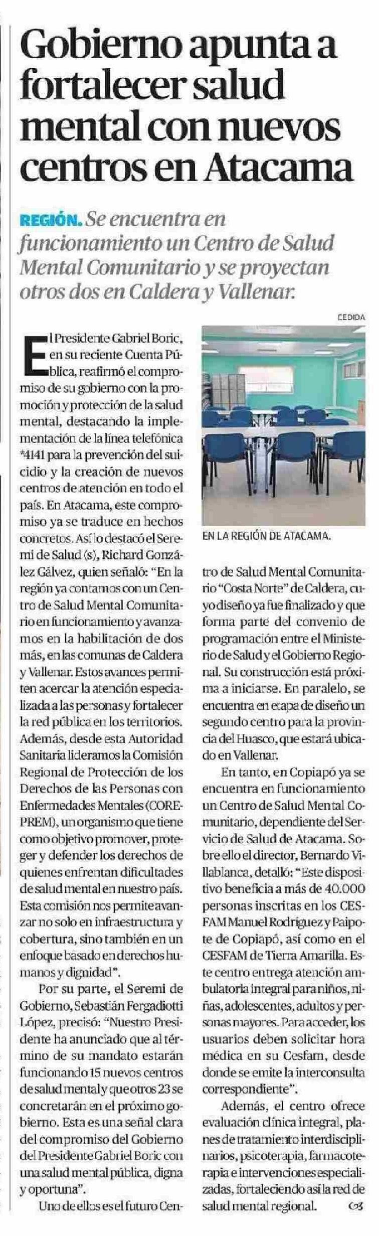 Gobierno apunta a mental con nuevos fortalecer salud centros en Atacama