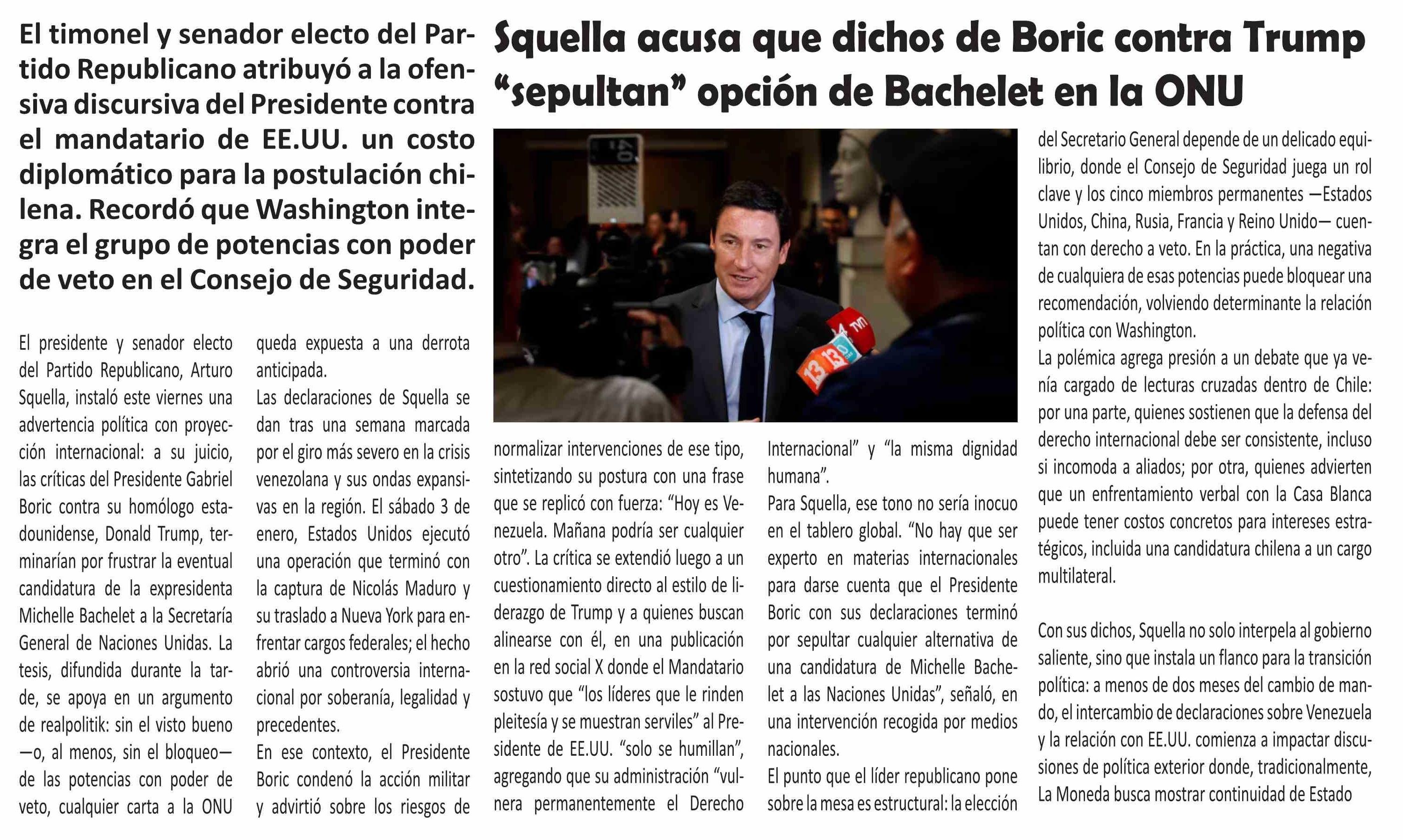 Squella acusa que dichos de Boric contra Trump "sepultan" opción de Bachelet en la ONU