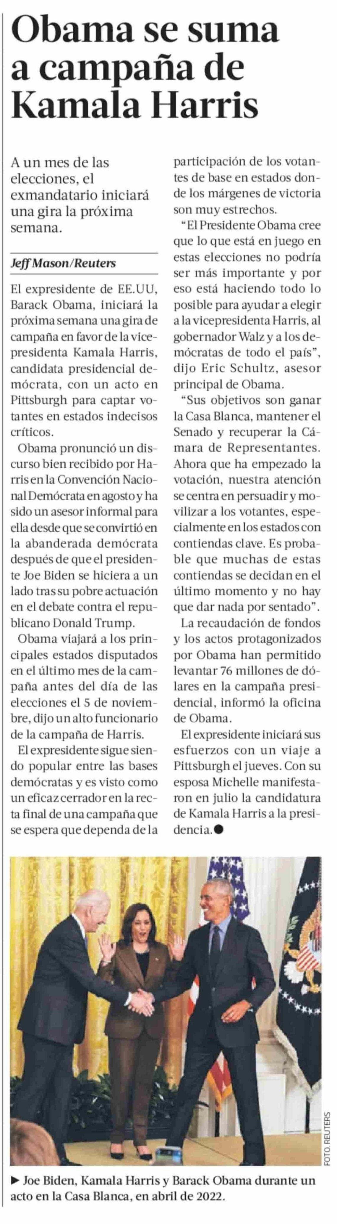 Obama se suma a campaña de Kamala Harris