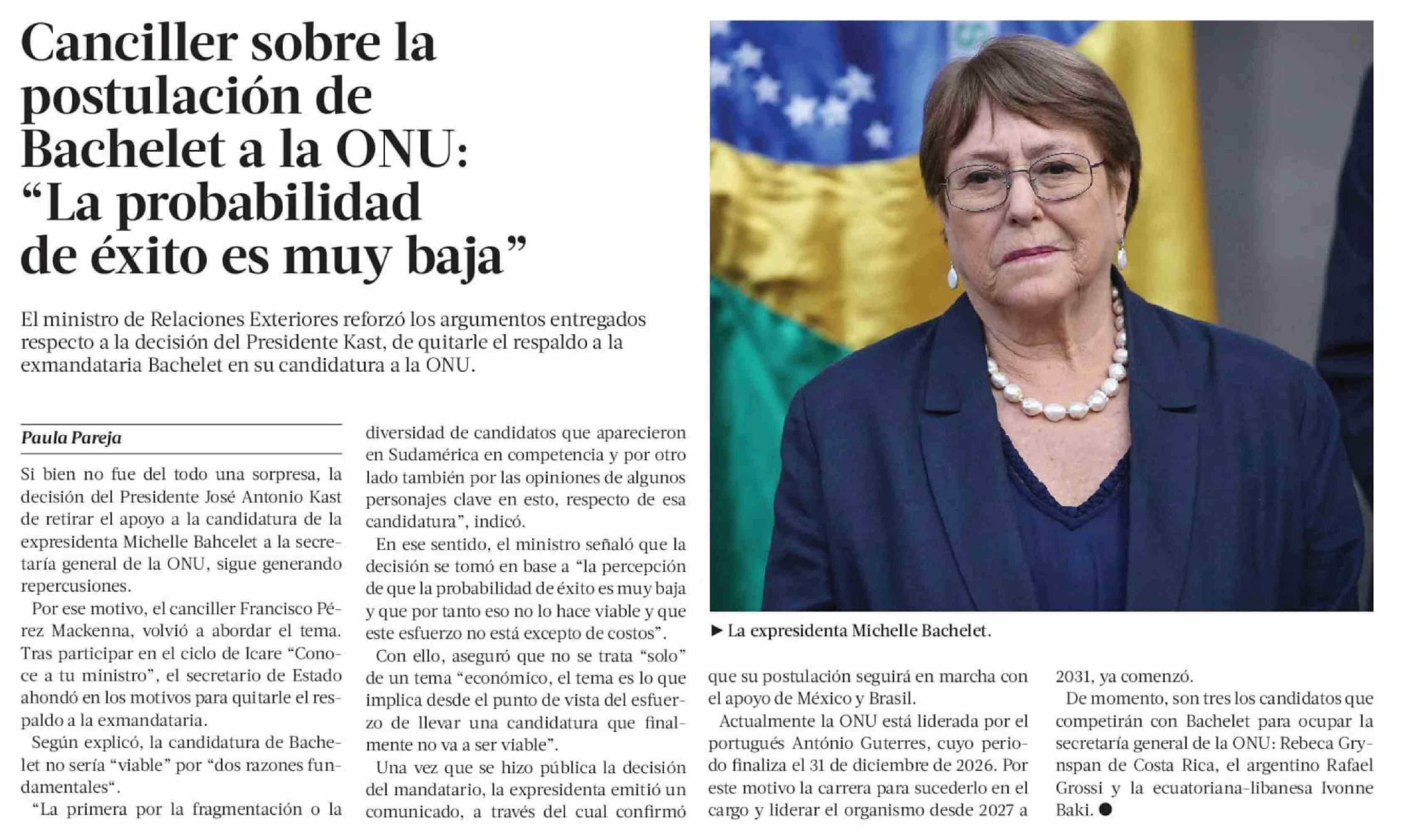 Canciller sobre la postulación de Bachelet a la ONU: "La probabilidad de éxito es muy baja"