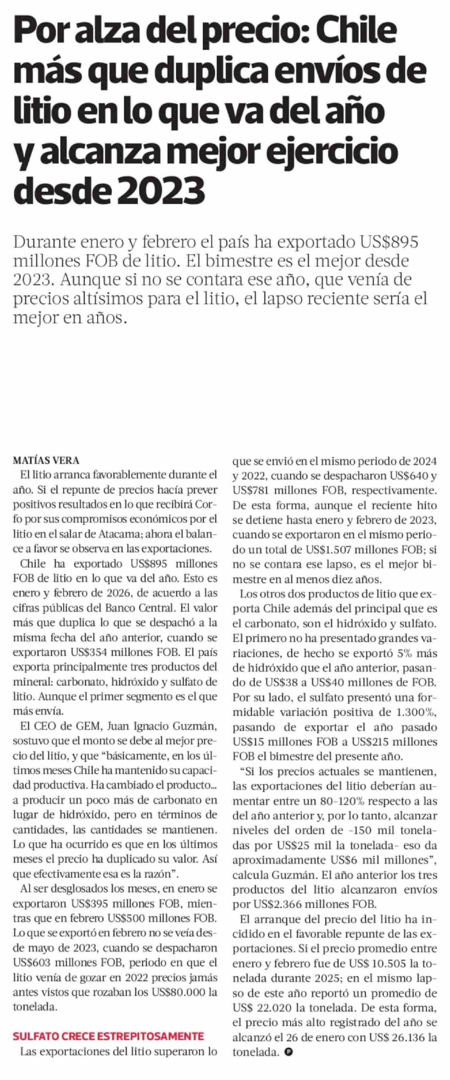 Por alza del precio: Chile más que duplica envíos de litio en lo que va del año y alcanza mejor ejercicio desde 2023