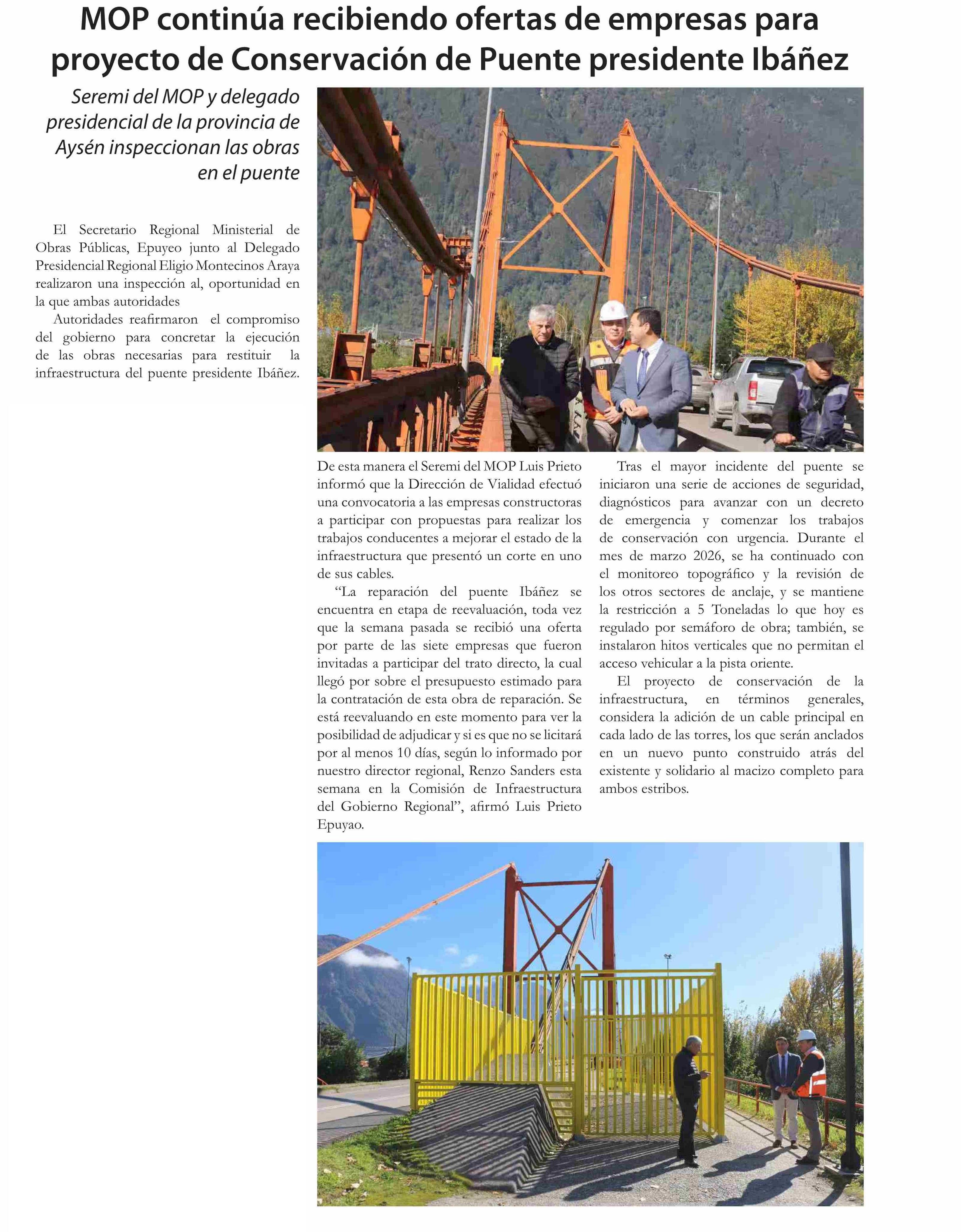 MOP continúa recibiendo ofertas de empresas para proyecto de Conservación de Puente presidente Ibáñez