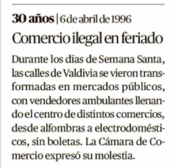 Título: 30 años | 6de abril de 1996 Comercio ilegal en feriado Durante los días de Semana Santa, las calles de Valdivia se vieron transformadas en mercados públicos, con vendedores ambulantes llenando el centro de distintos comercios, desde alfombras a electrodomésti cos, sin boletas. La Cámara de Comercio