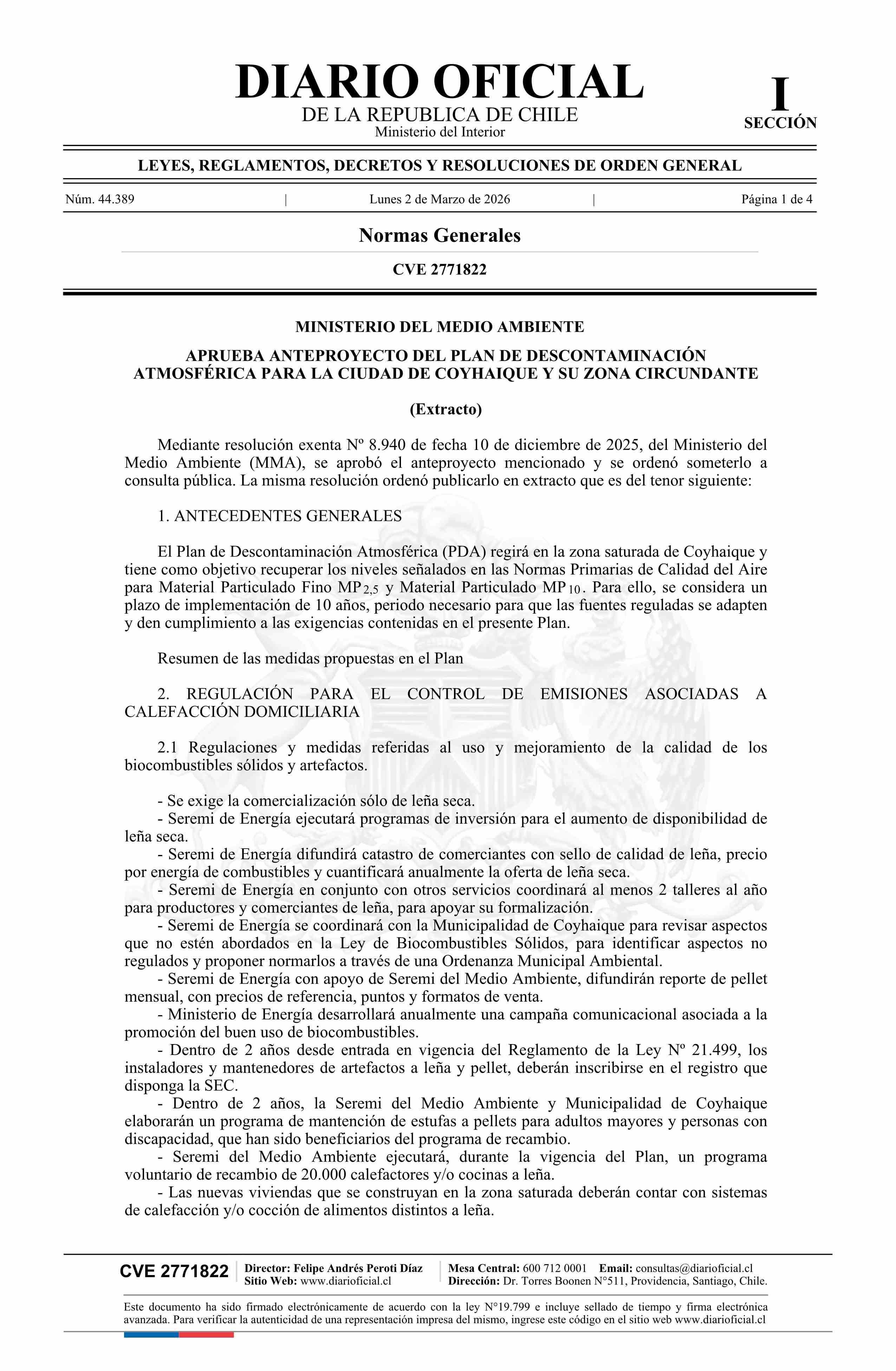 | Título: | Extracto de resolución exenta número 8.940, de 2025.- Aprueba anteproyecto del Plan de Descontaminación Atmosférica para la ciudad de Coyhaique y su zona circundante, y lo somete a consulta pública |