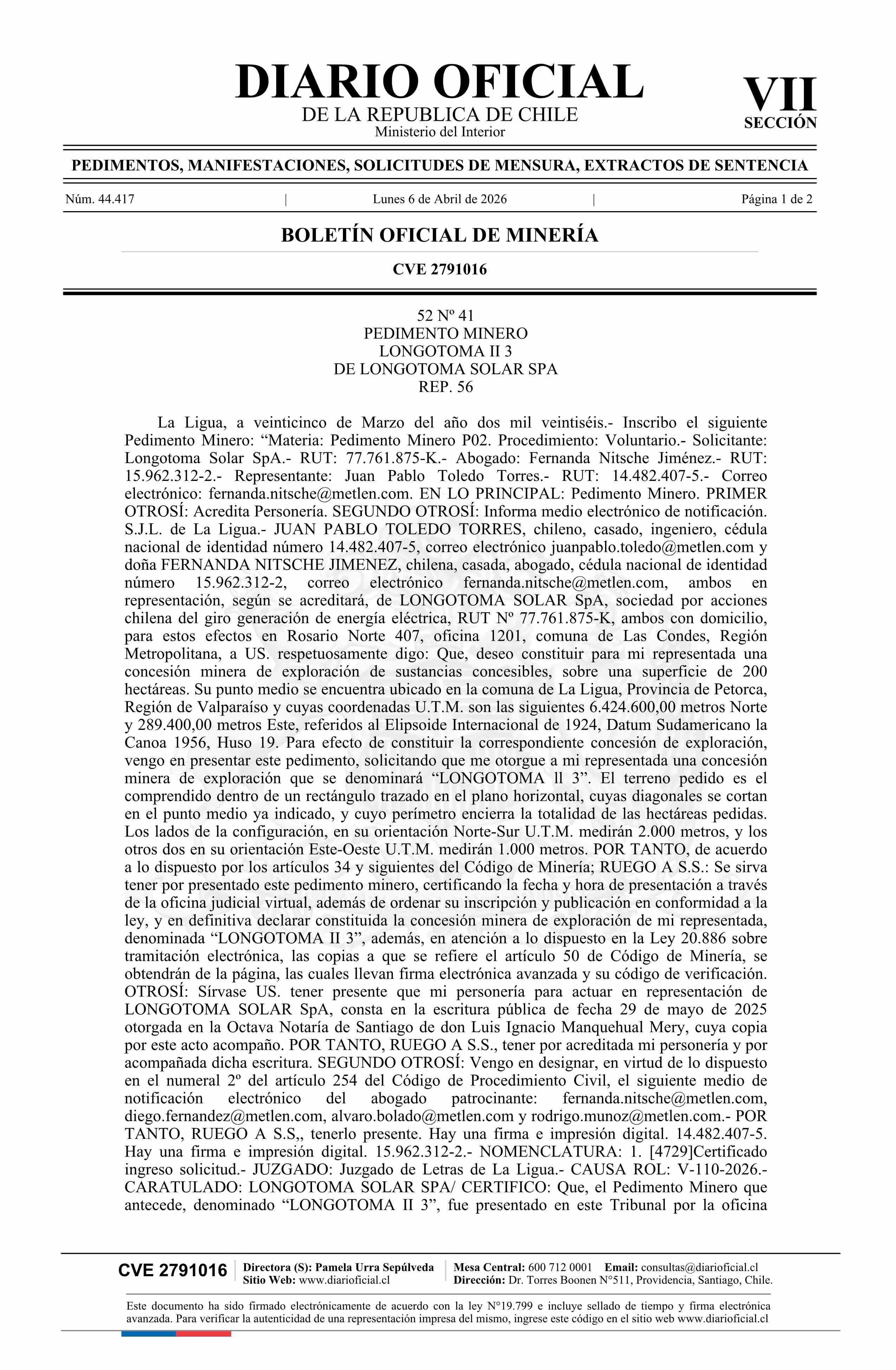 DIARIO OFICIAL CHILE - BOLETÍN OFICIAL DE MINERÍA (DIARIO OFICIAL CHILE – BOM – PEDIMENTOS MINEROS)