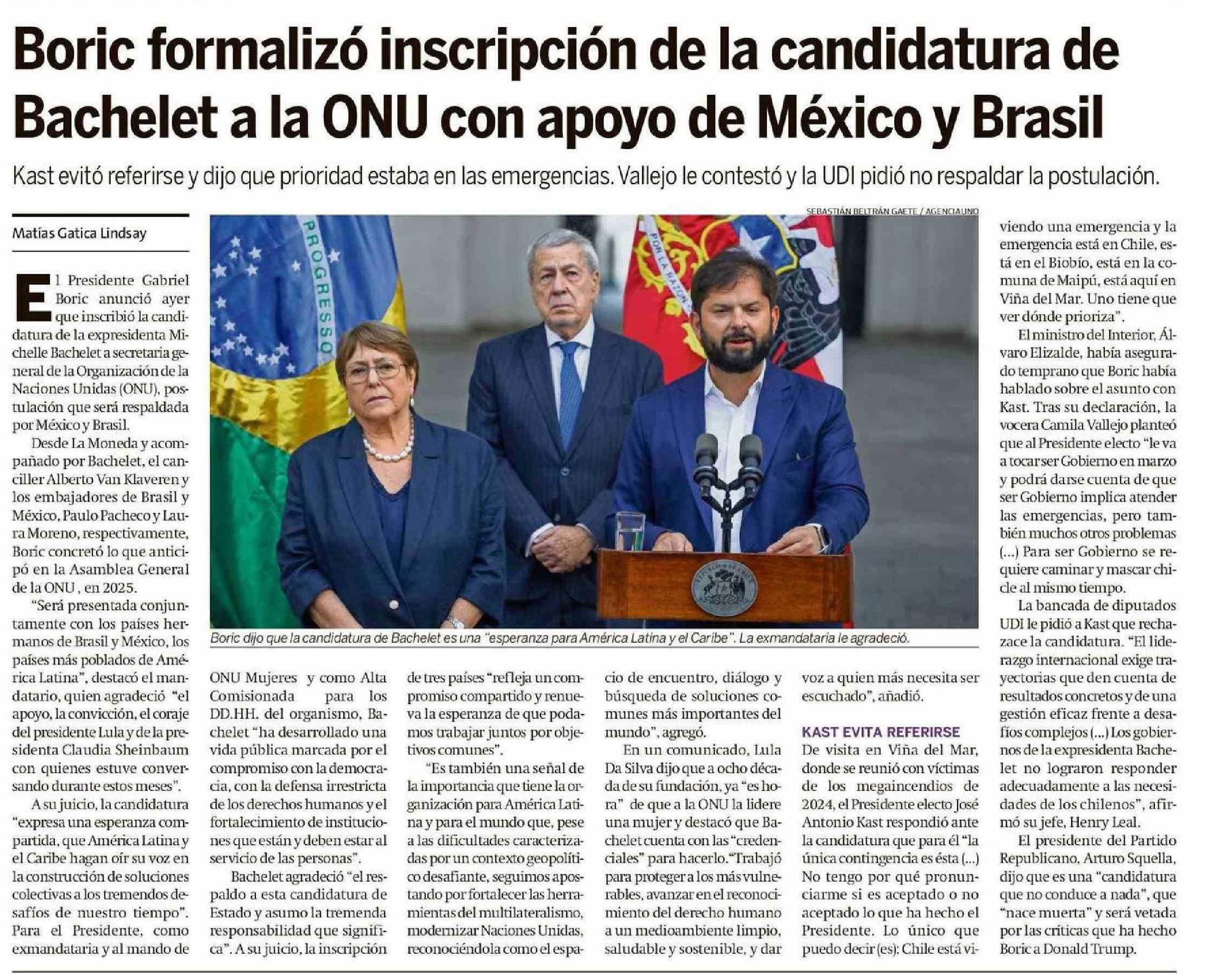 Boric formalizó inscripción de la candidatura de Bachelet a la ONU con apoyo de México y Brasil