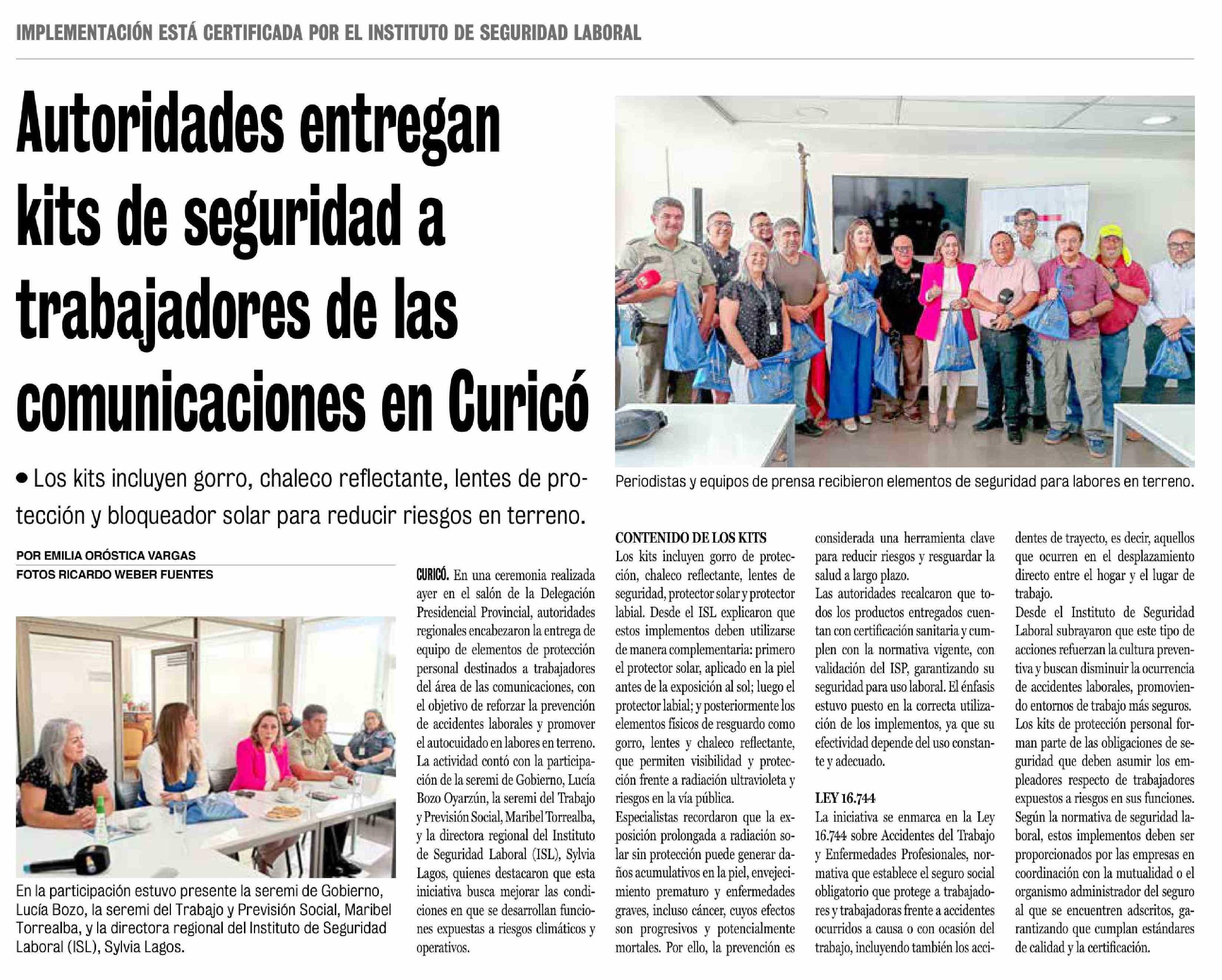 Autoridades entregan kits de seguridad a trabajadores de las comunicaciones en Curicó