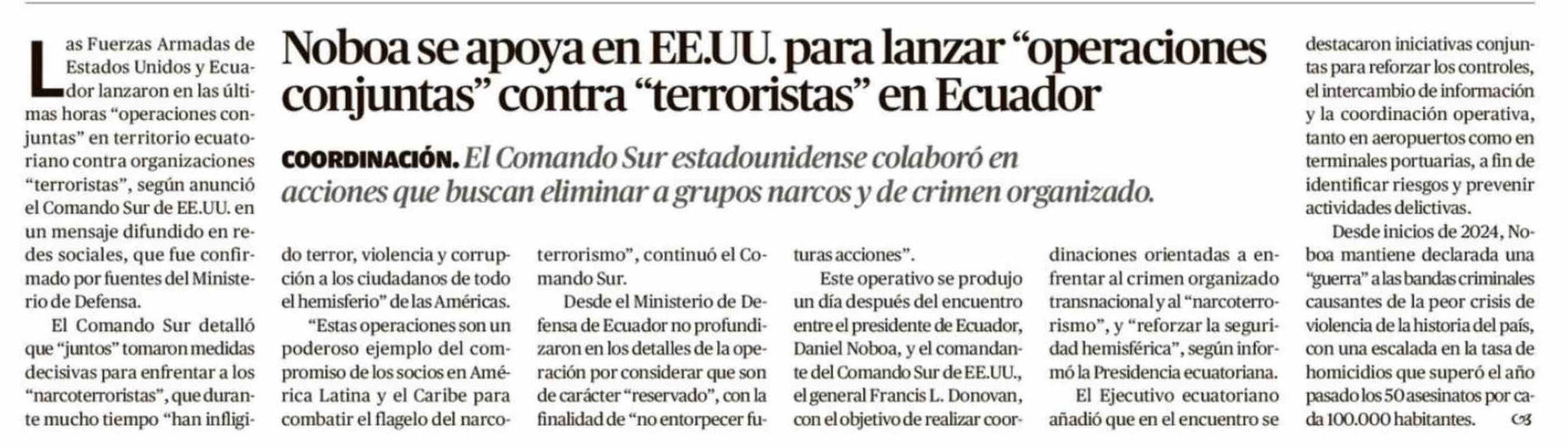 Noboa se apoya en EE.UU. para lanzar "operaciones conjuntas" contra "terroristas" en Ecuador