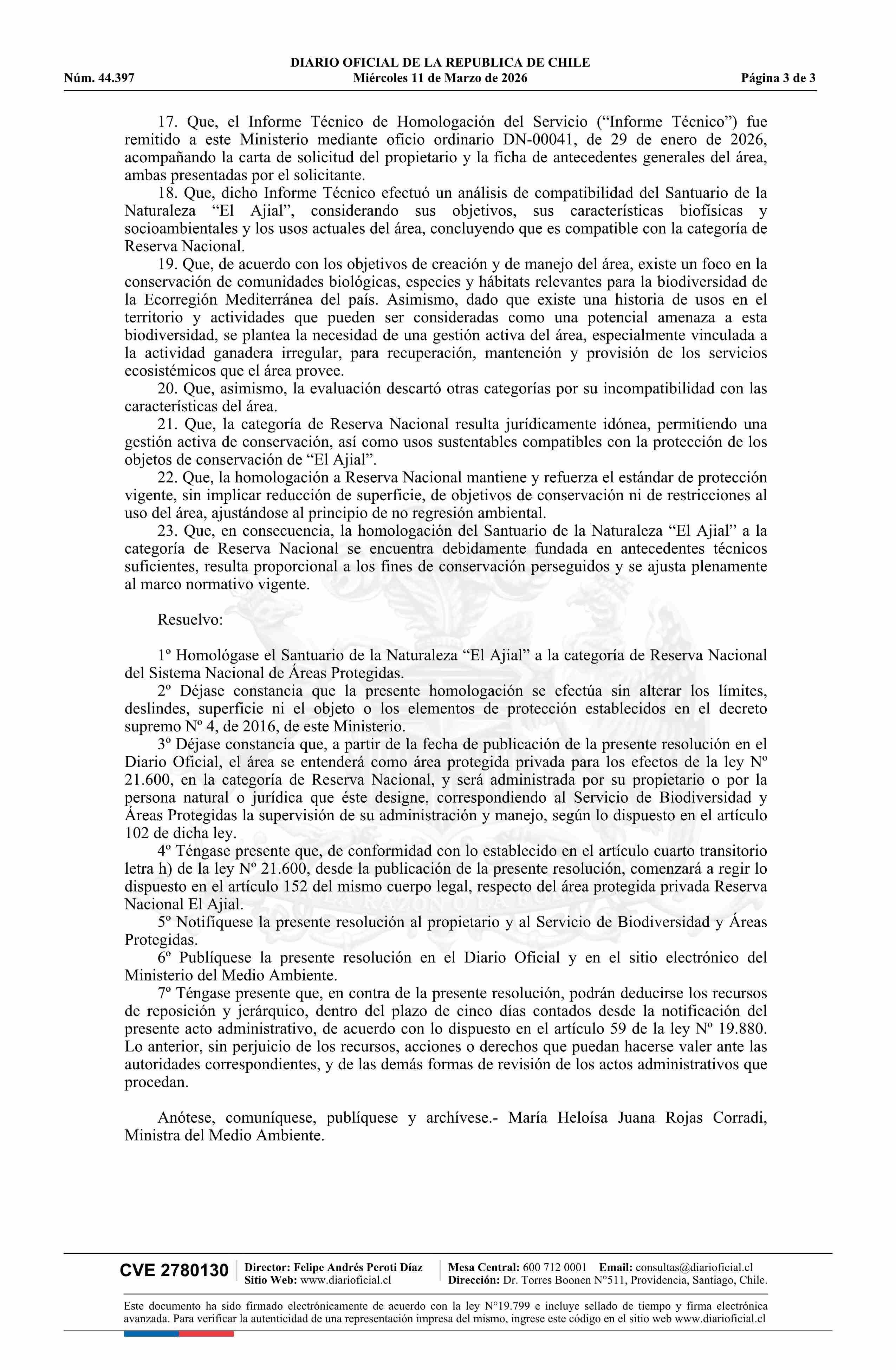 | Título: | Resolución exenta número 1.012, de 2026.- Homologa el Santuario de la Naturaleza El Ajial, en la comuna de Paine, a la Categoría de Reserva Nacional del Sistema Nacional de Áreas Protegidas |
