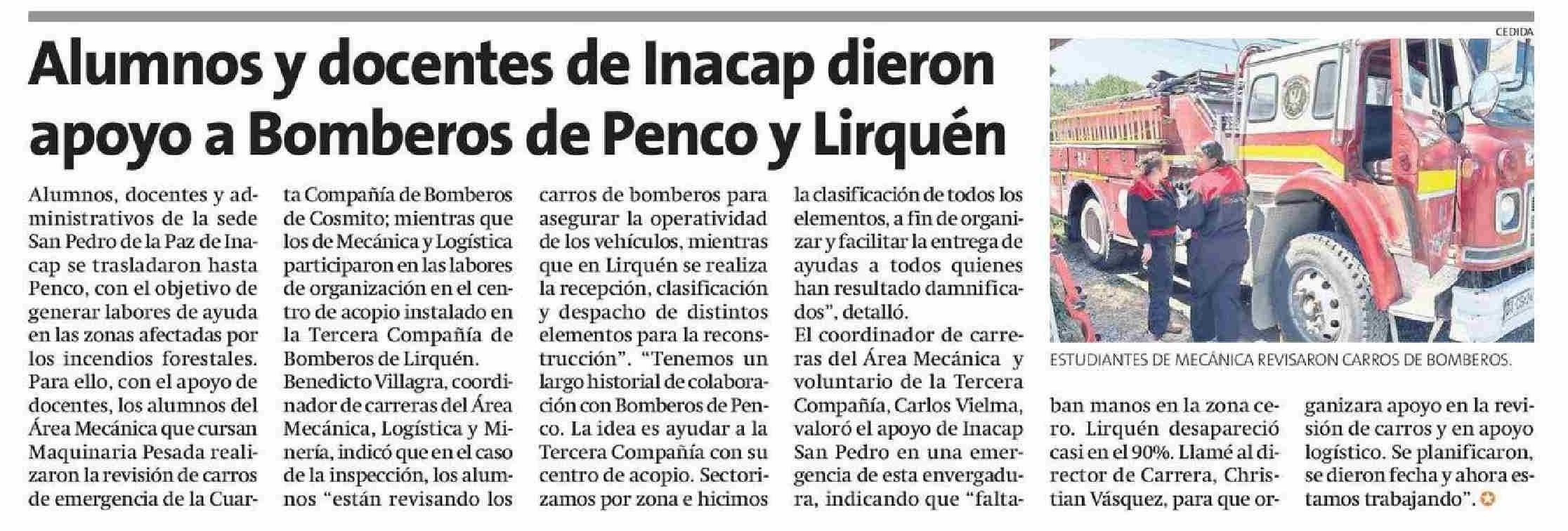 Alumnos y docentes de Inacap dieron apoyo a Bomberos de Penco y Lirquen