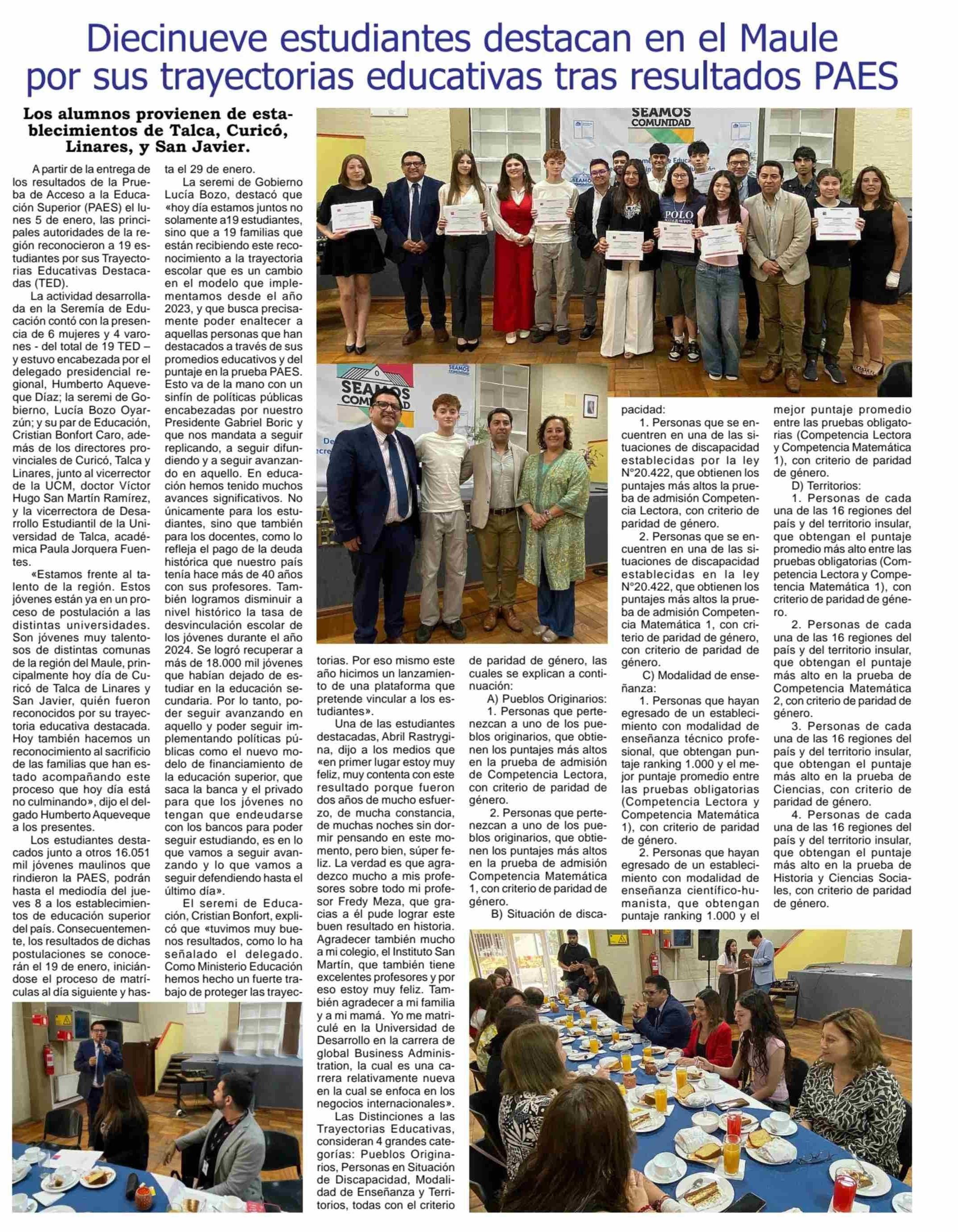 Diecinueve estudiantes destacan en el Maule por sus trayectorias educativas tras resultados PAES