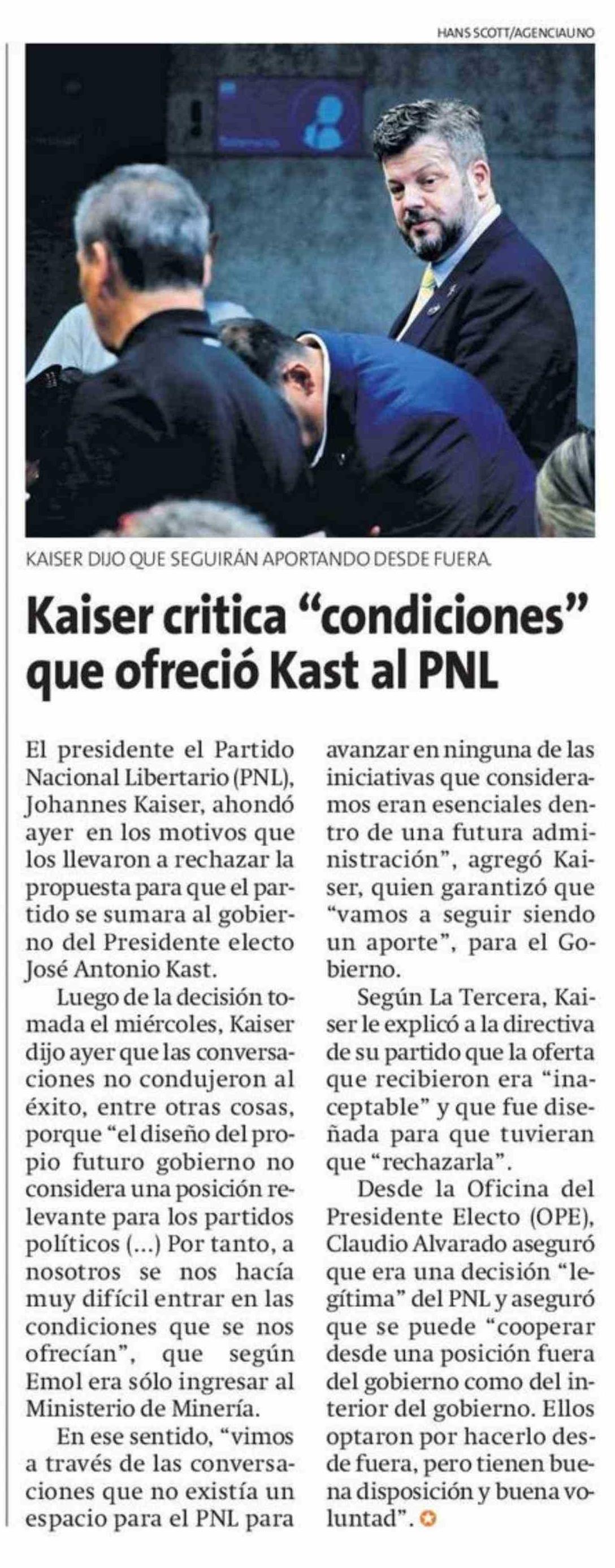 Kaiser critica "condiciones" que ofreció Kast al PNL