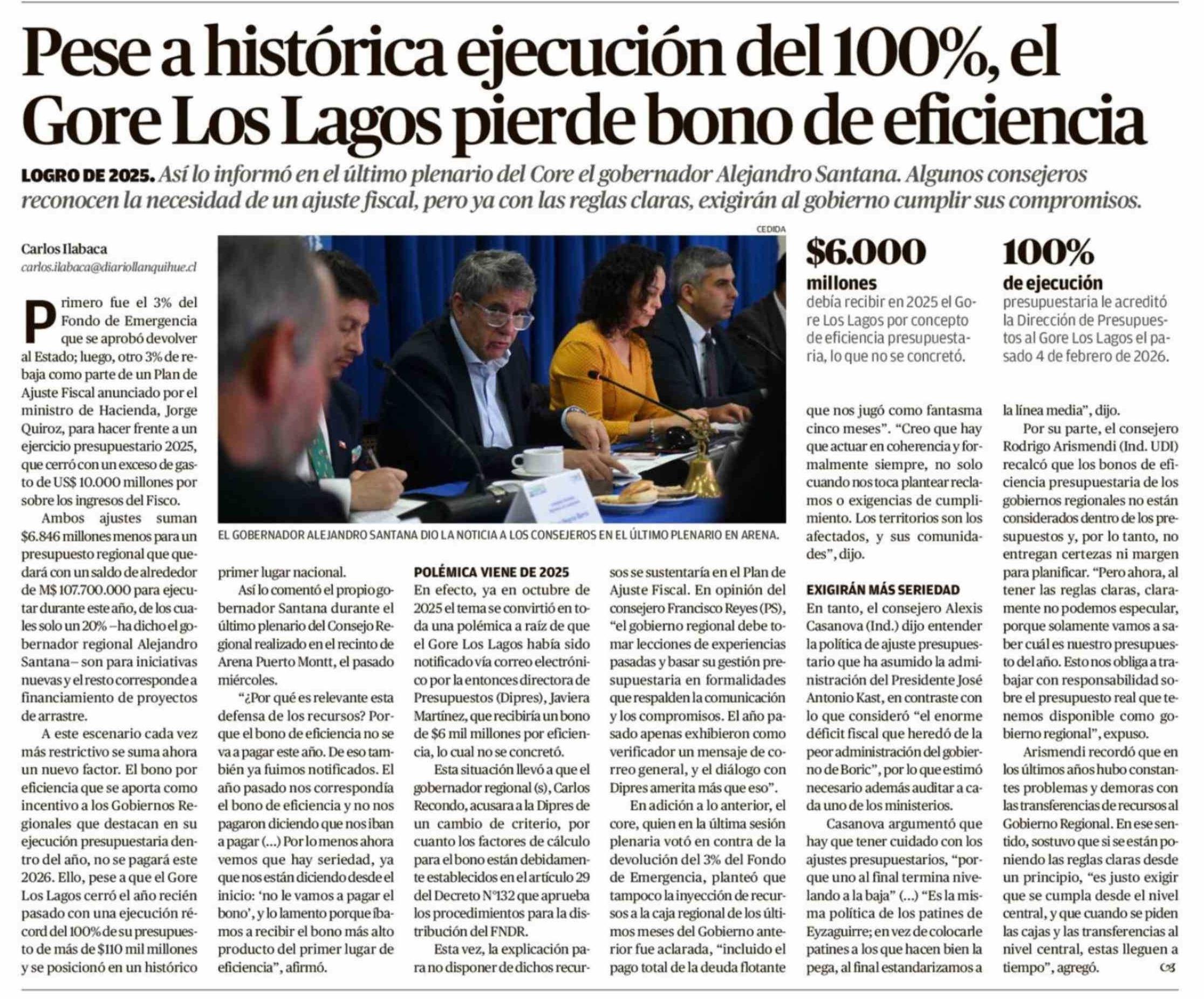 Pese a histórica ejecución del 100%, el Gore Los Lagos pierde bono de eficiencia