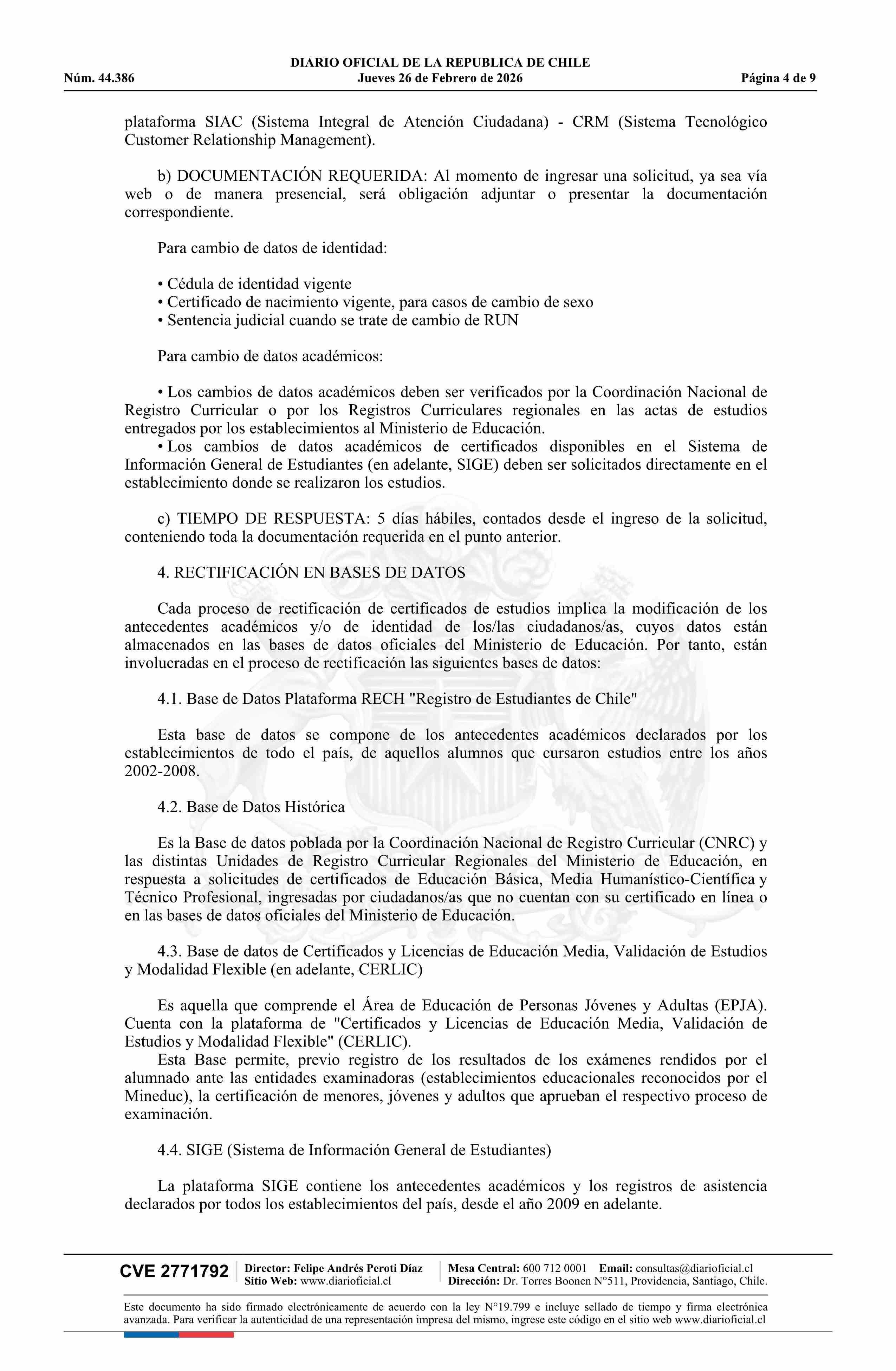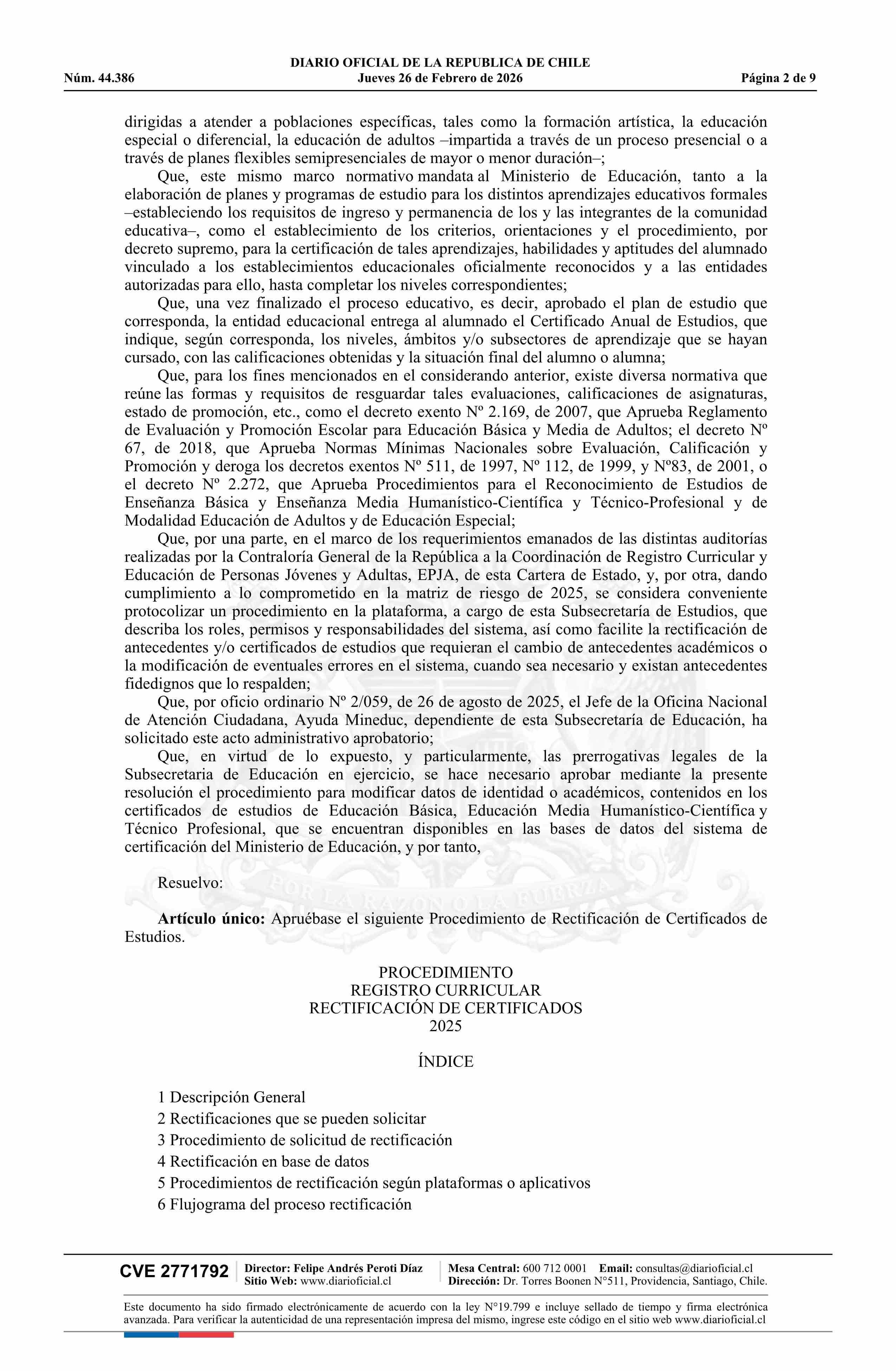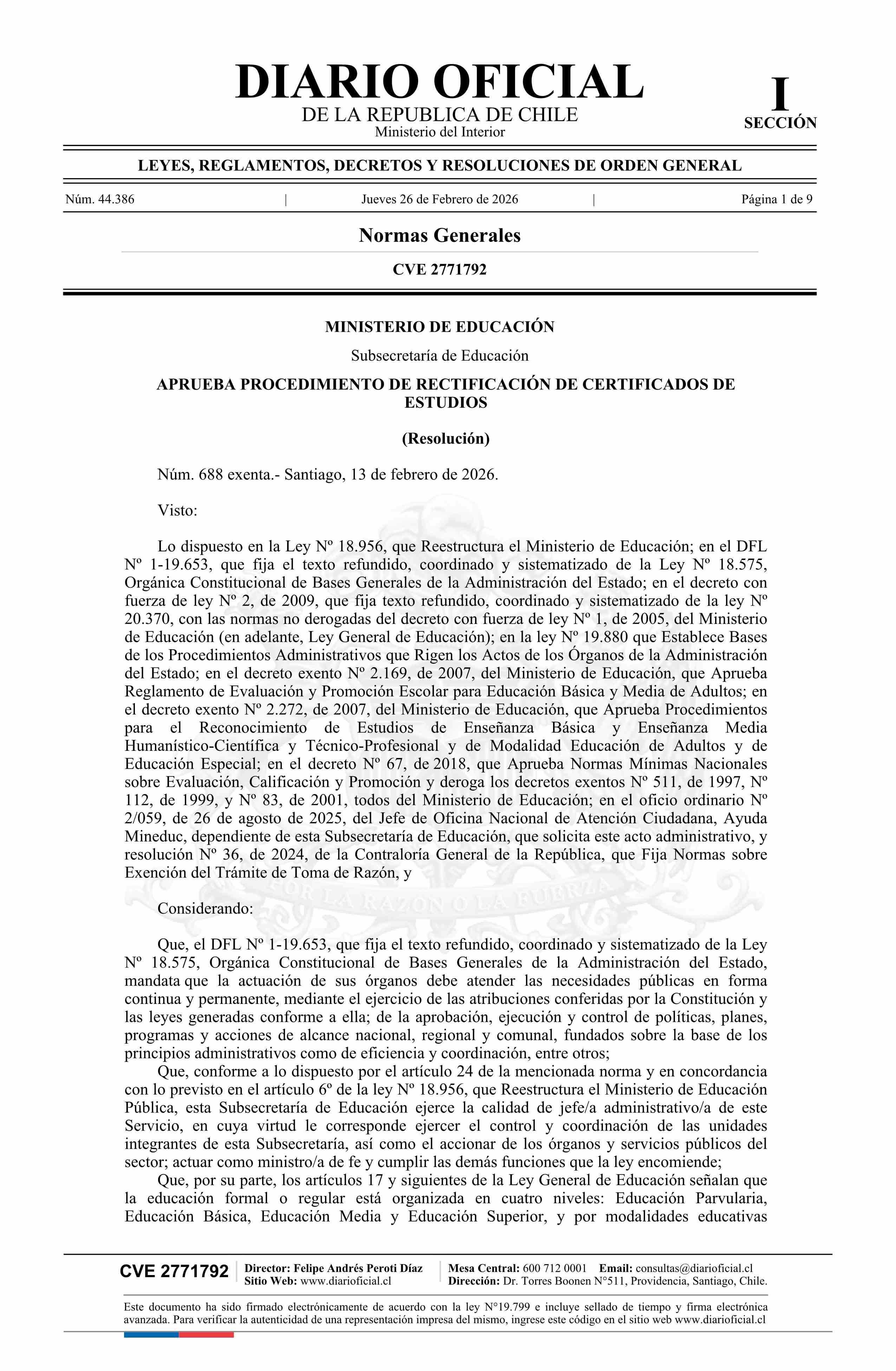 | Título: | Resolución exenta número 688, de 2026.- Aprueba procedimiento de rectificación de certificados de estudios |
