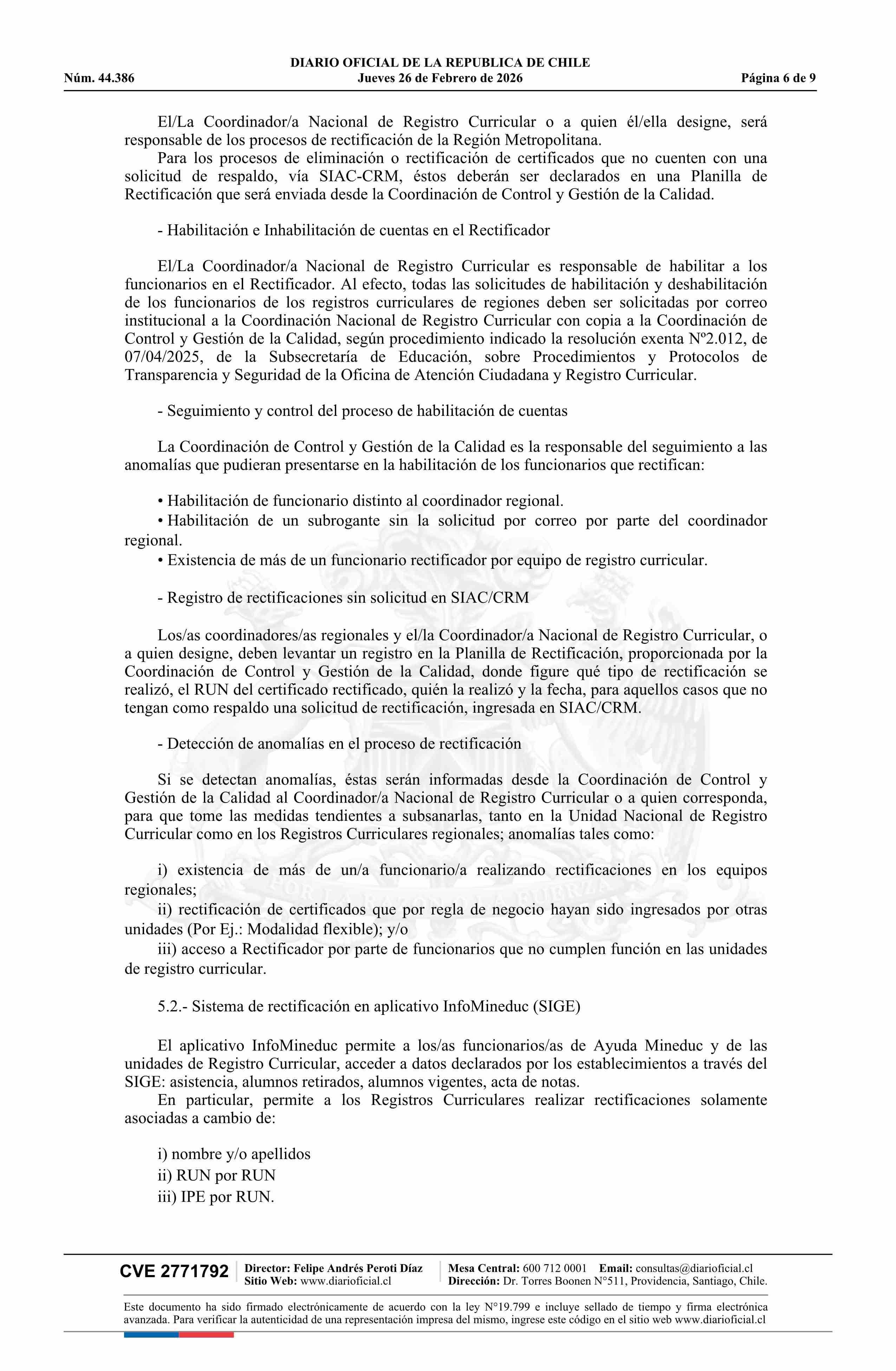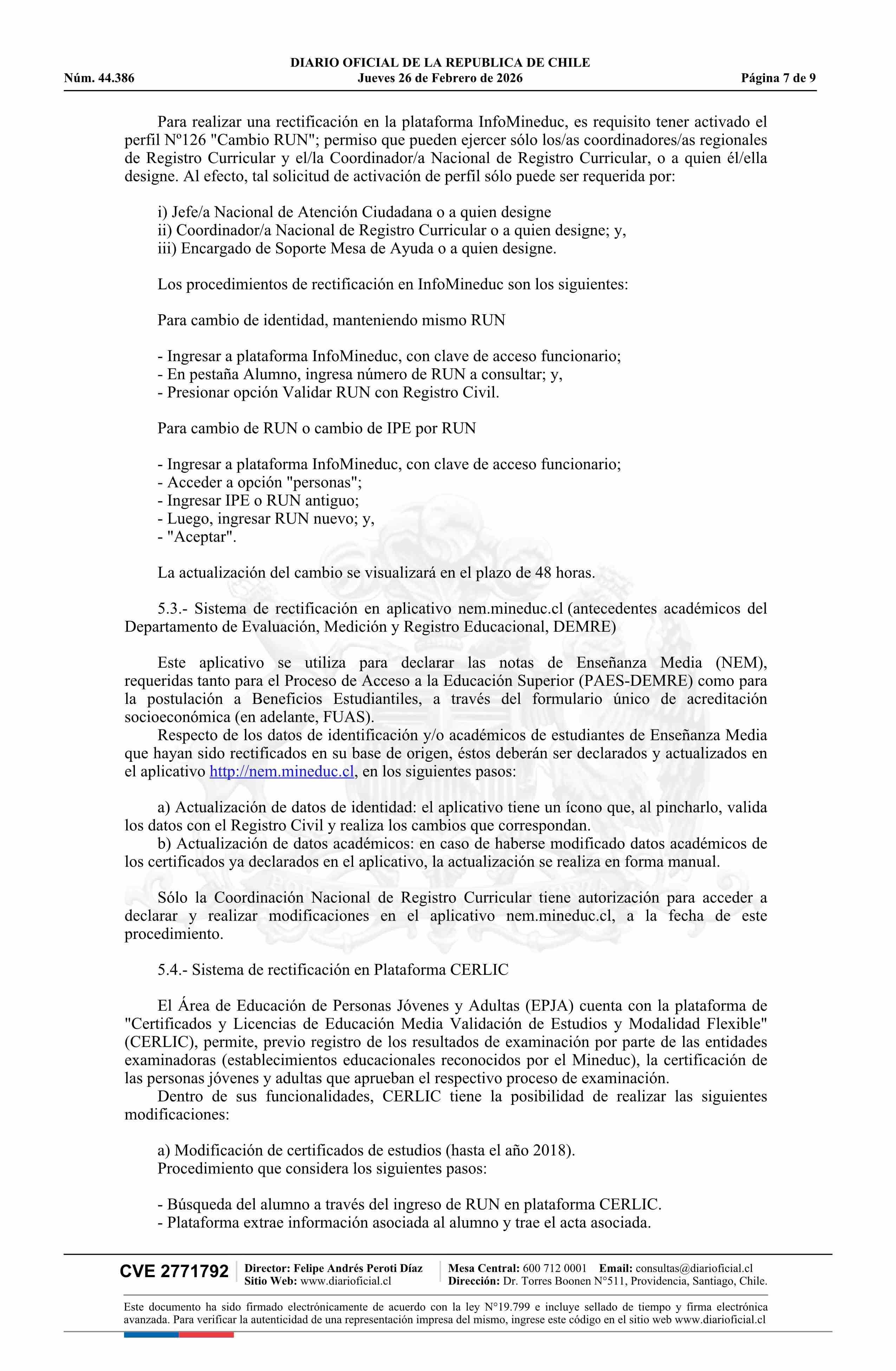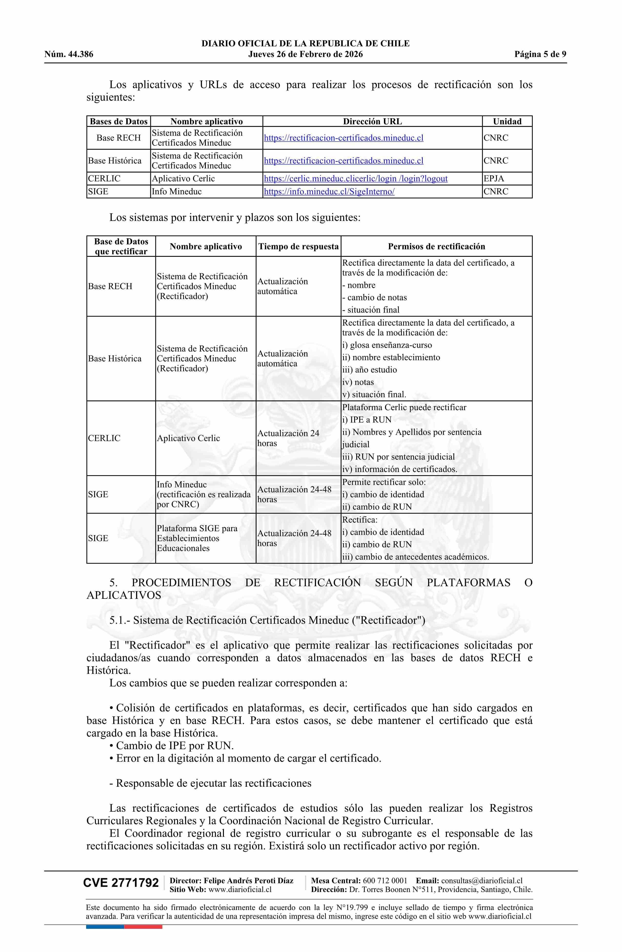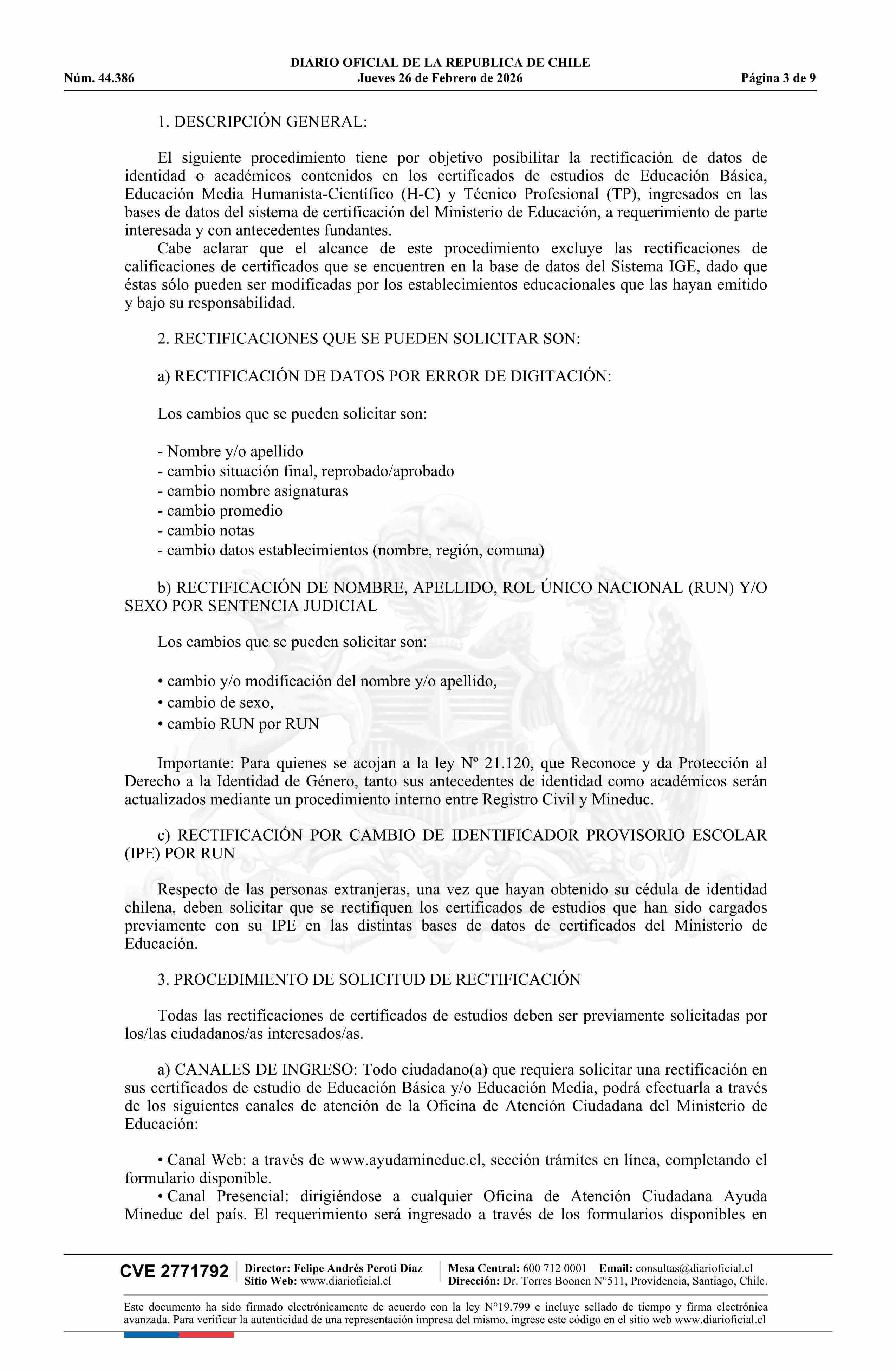 | Título: | Resolución exenta número 688, de 2026.- Aprueba procedimiento de rectificación de certificados de estudios |